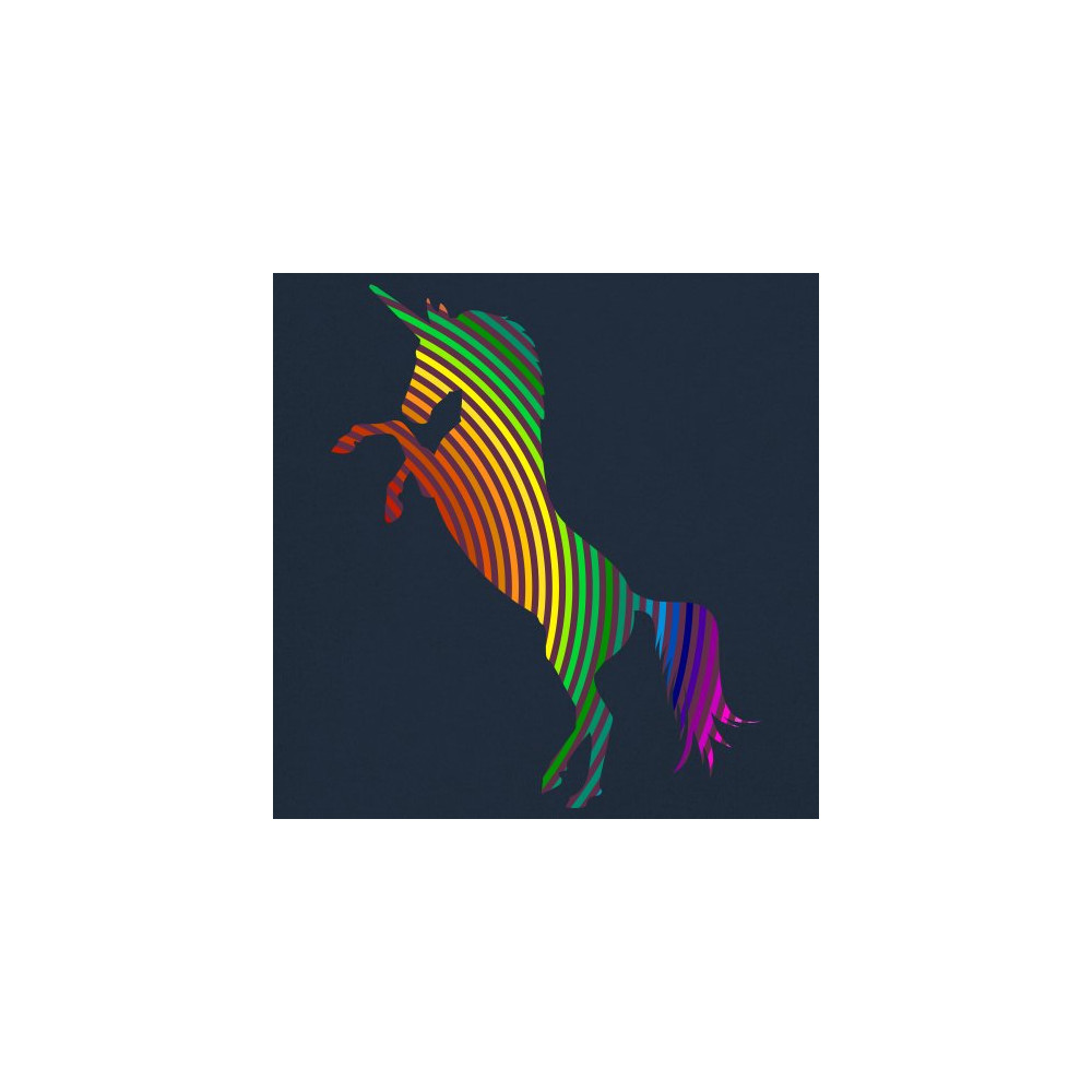 The print depicts a strong rearing unicorn. The unicorn is painted in vivid rainbow-stripe colors. This can symbolize a strong spirit of the sexual and gender minority.