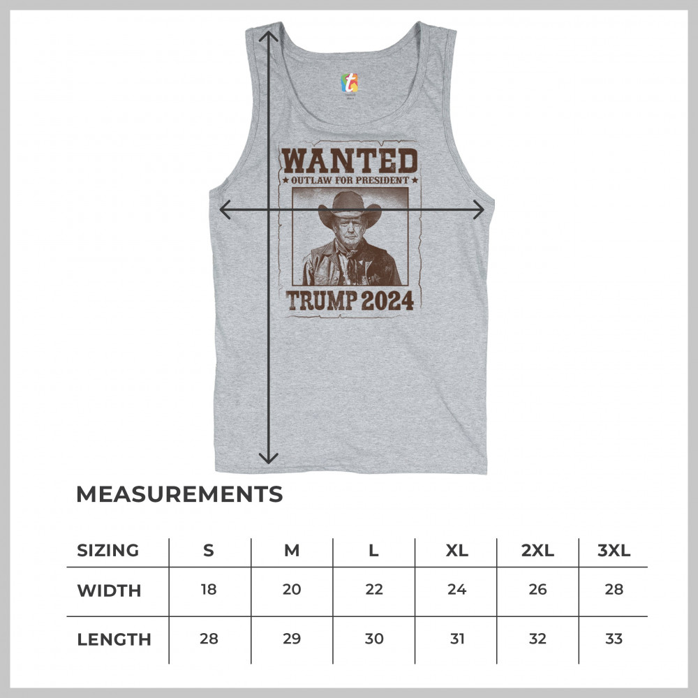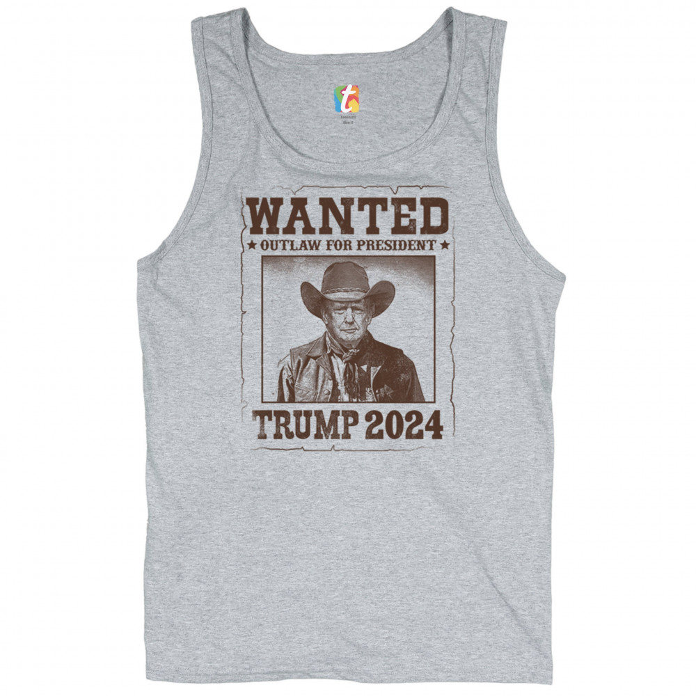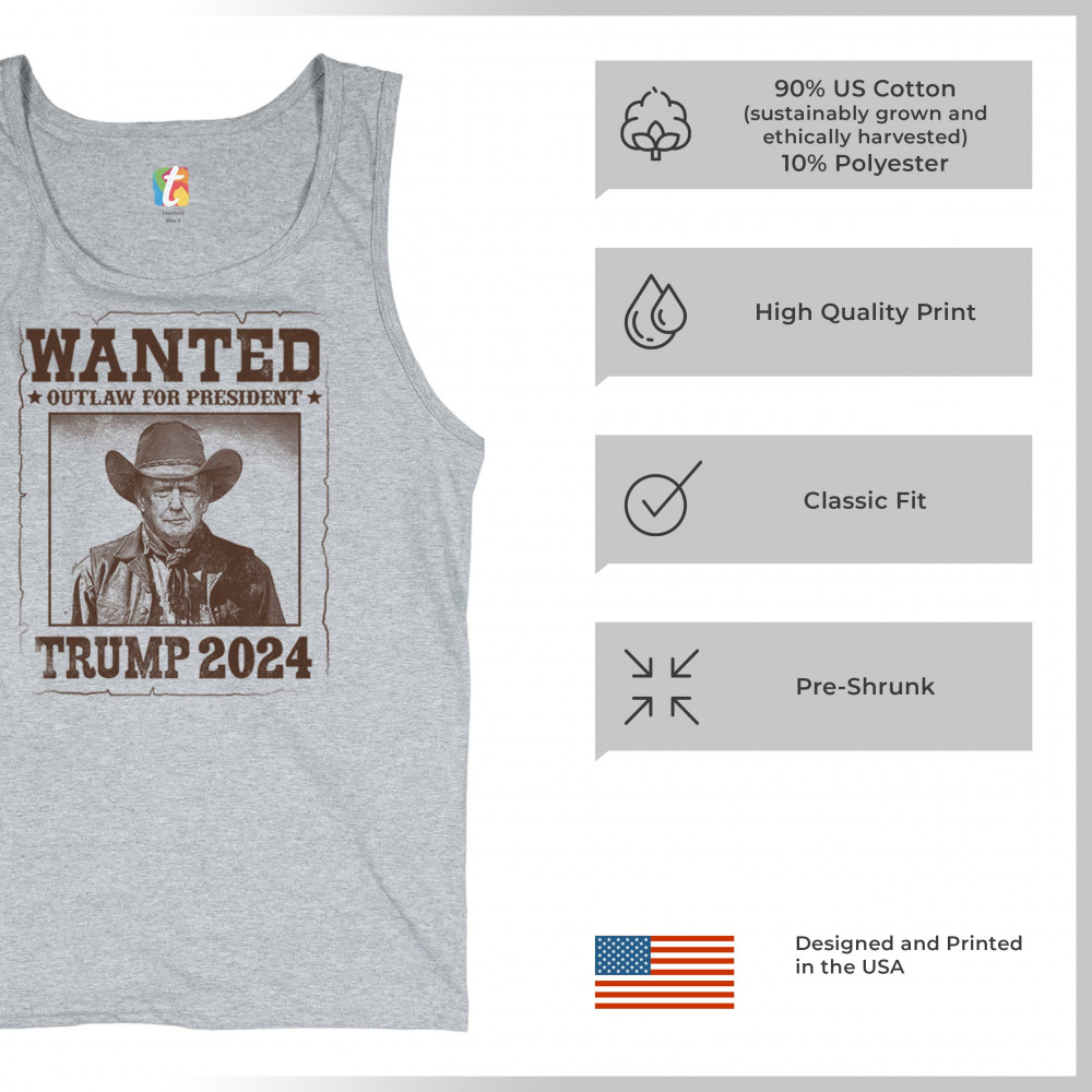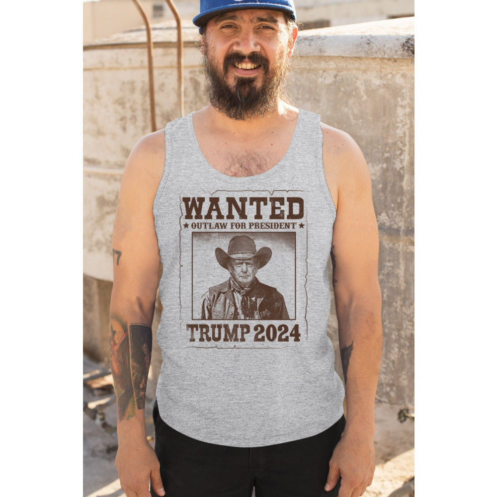 Bold "Wanted: Outlaw for President" design featuring Trump in cowboy attire, perfect for rally-goers and supporters. Express your support for the 2024 election.