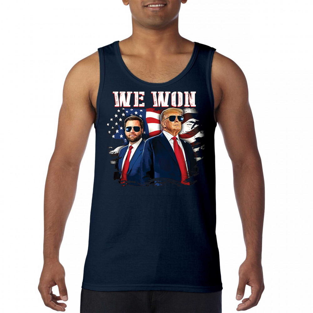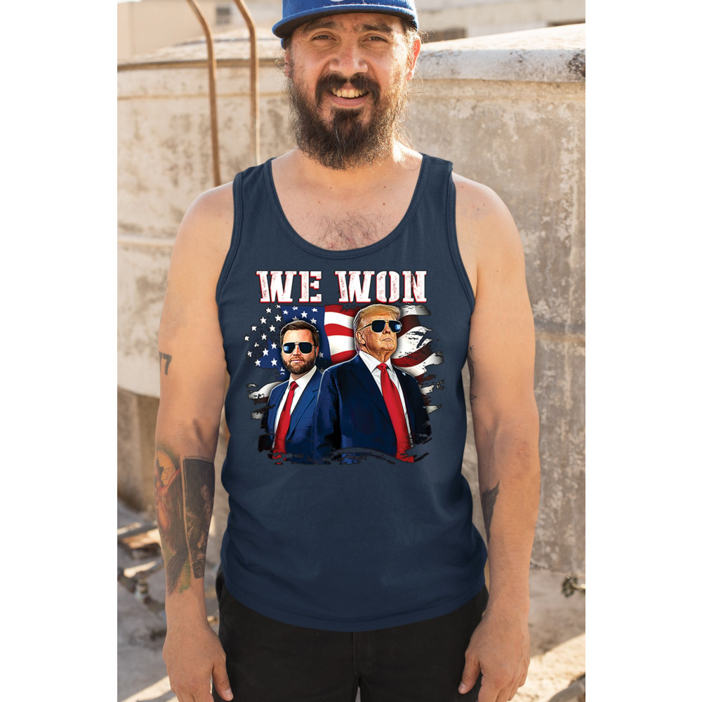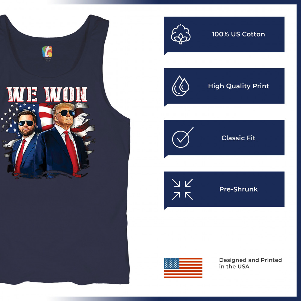 Celebrate Republican victory with this bold "We Won" design featuring Trump and patriotic flair—perfect for rallies, events, and patriotic pride.