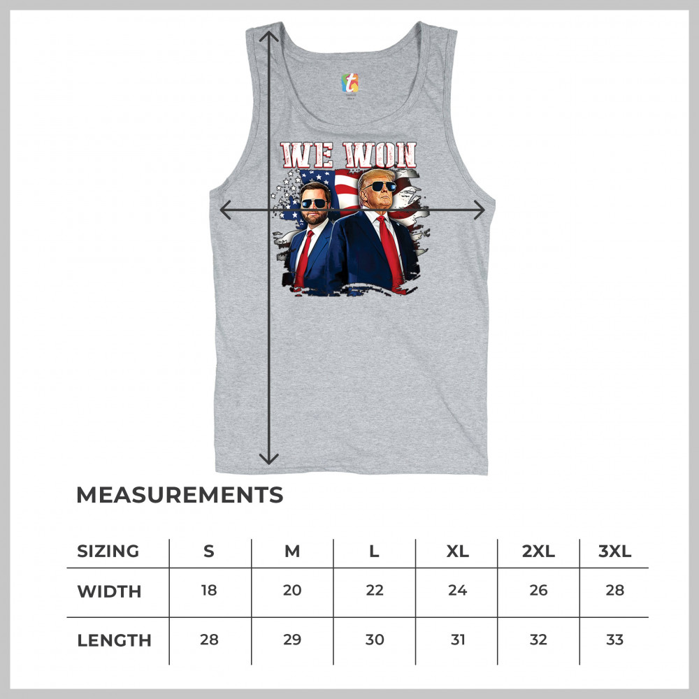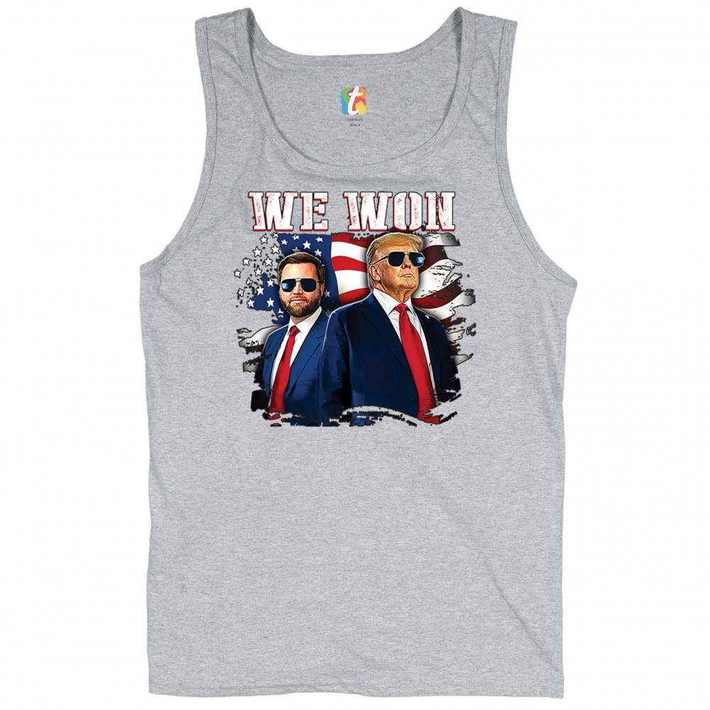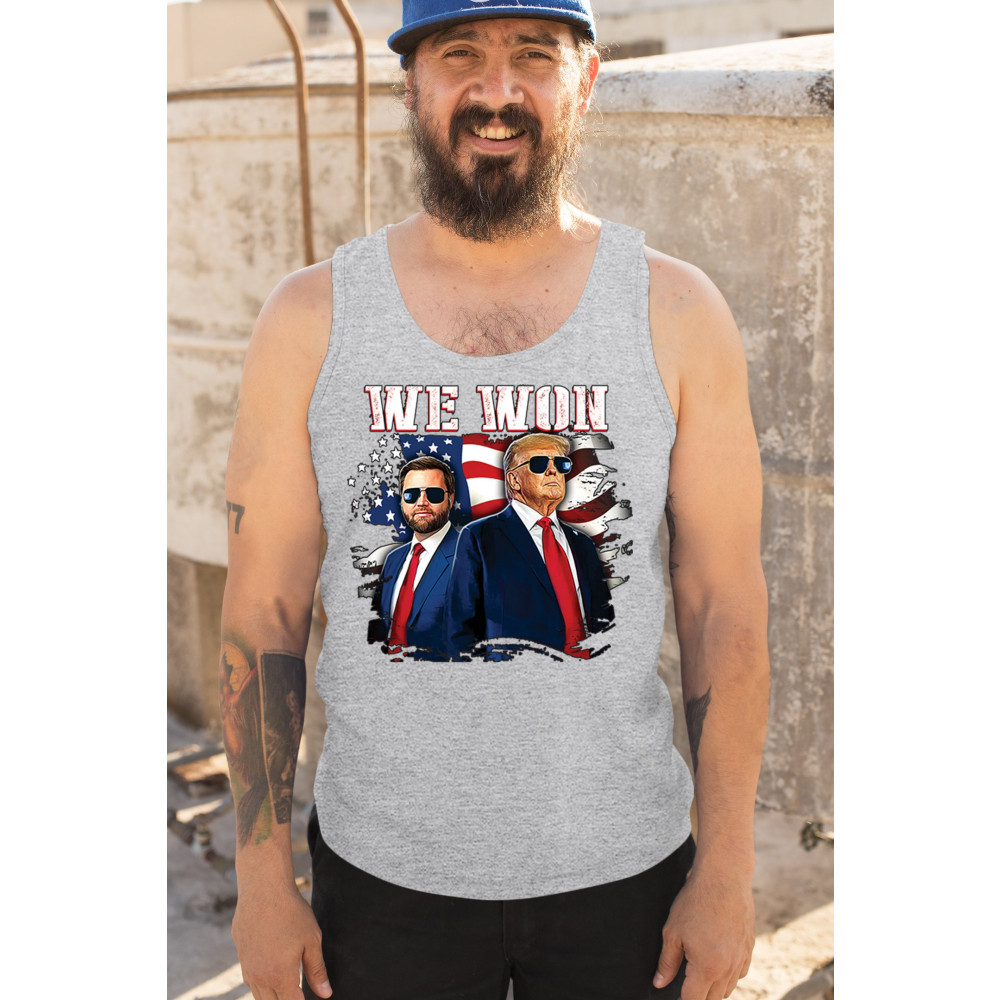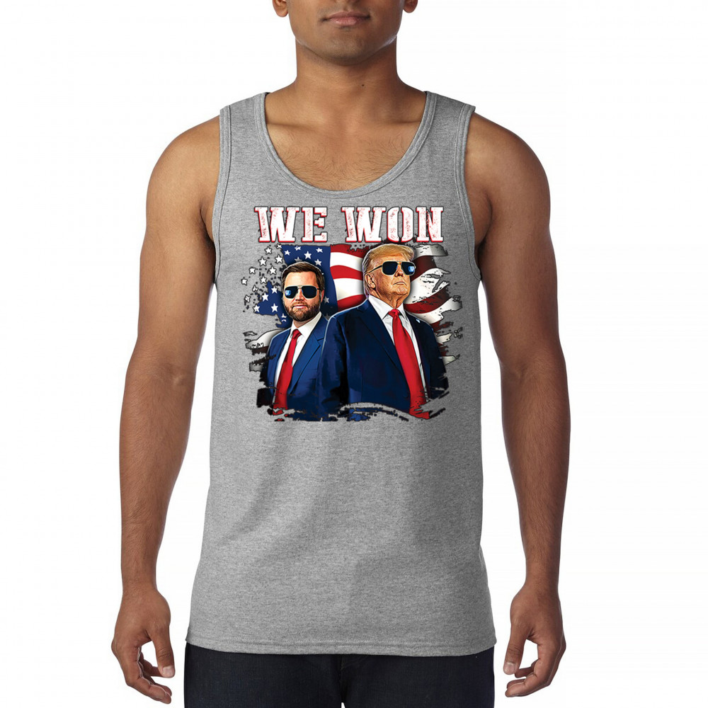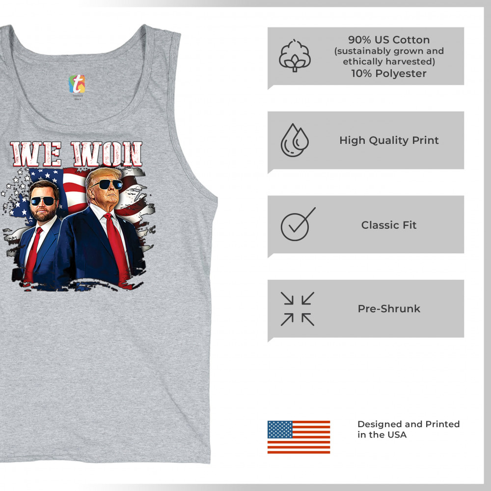 Celebrate Republican victory with this bold "We Won" design featuring Trump and patriotic flair—perfect for rallies, events, and patriotic pride.