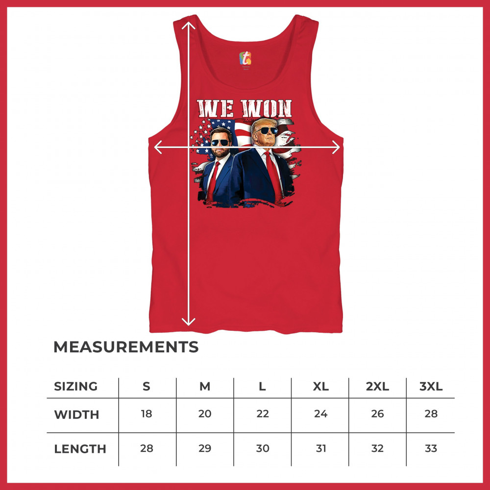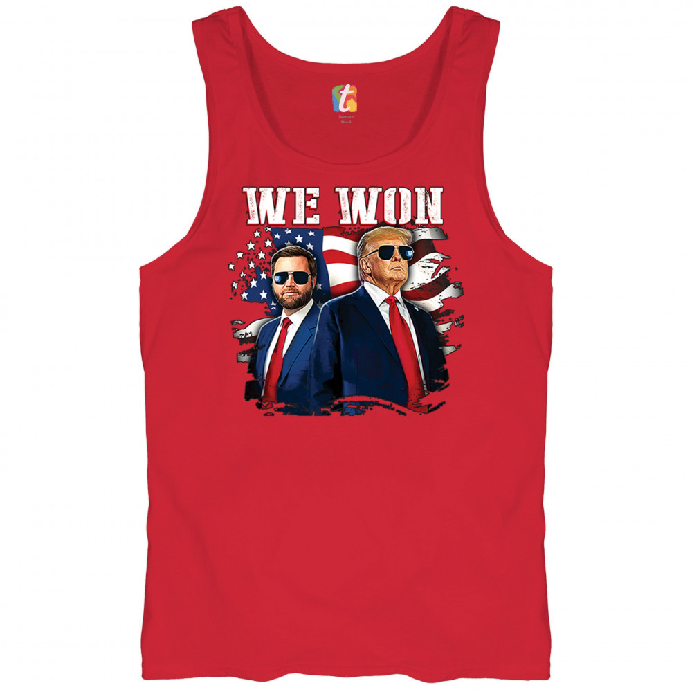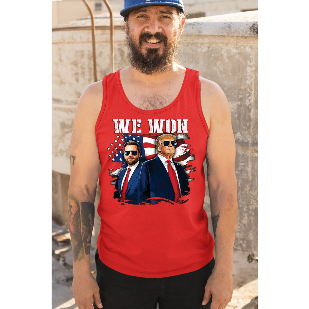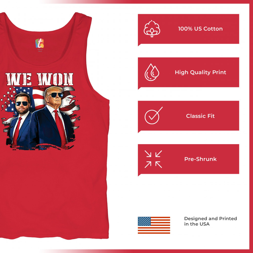 Celebrate Republican victory with this bold "We Won" design featuring Trump and patriotic flair—perfect for rallies, events, and patriotic pride.