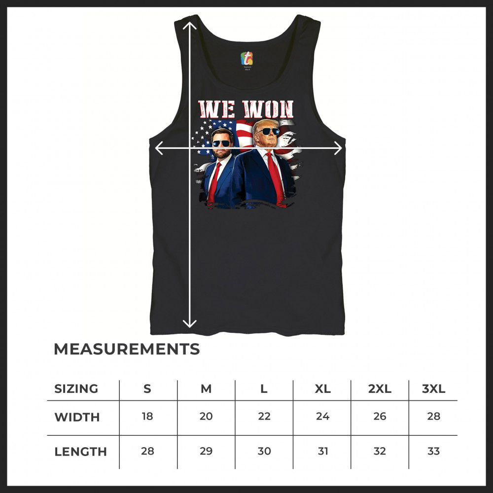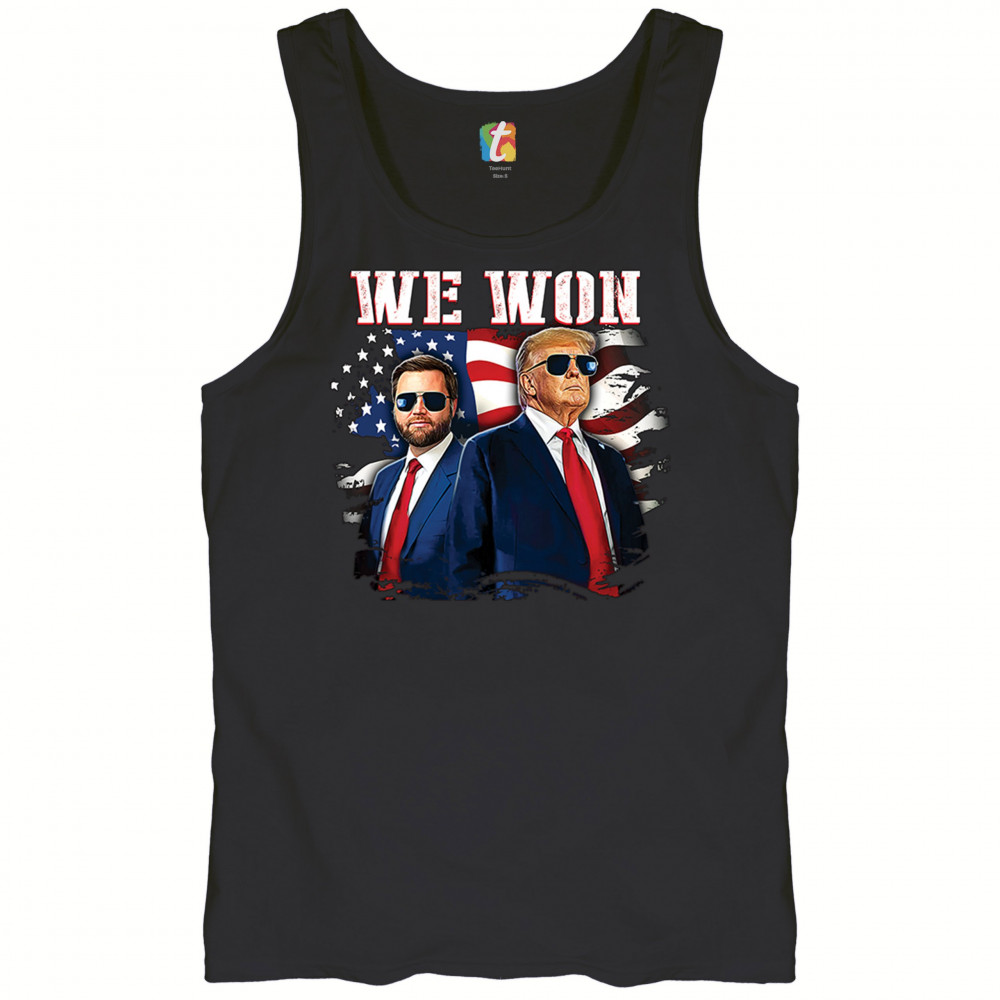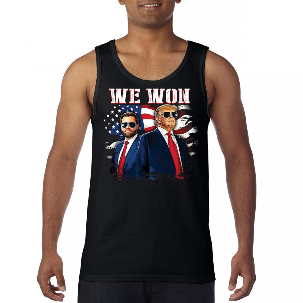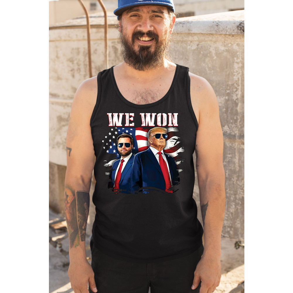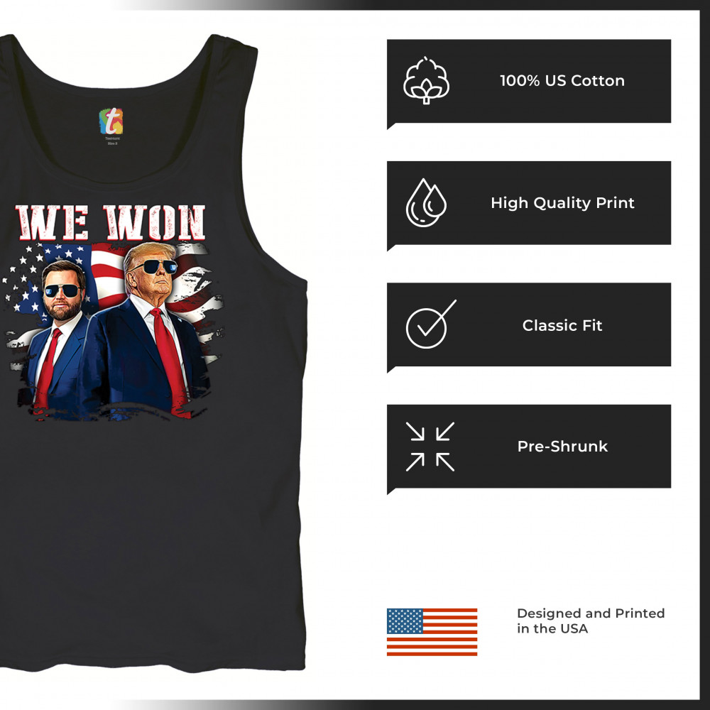 Celebrate Republican victory with this bold "We Won" design featuring Trump and patriotic flair—perfect for rallies, events, and patriotic pride.