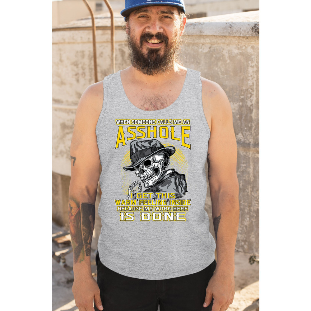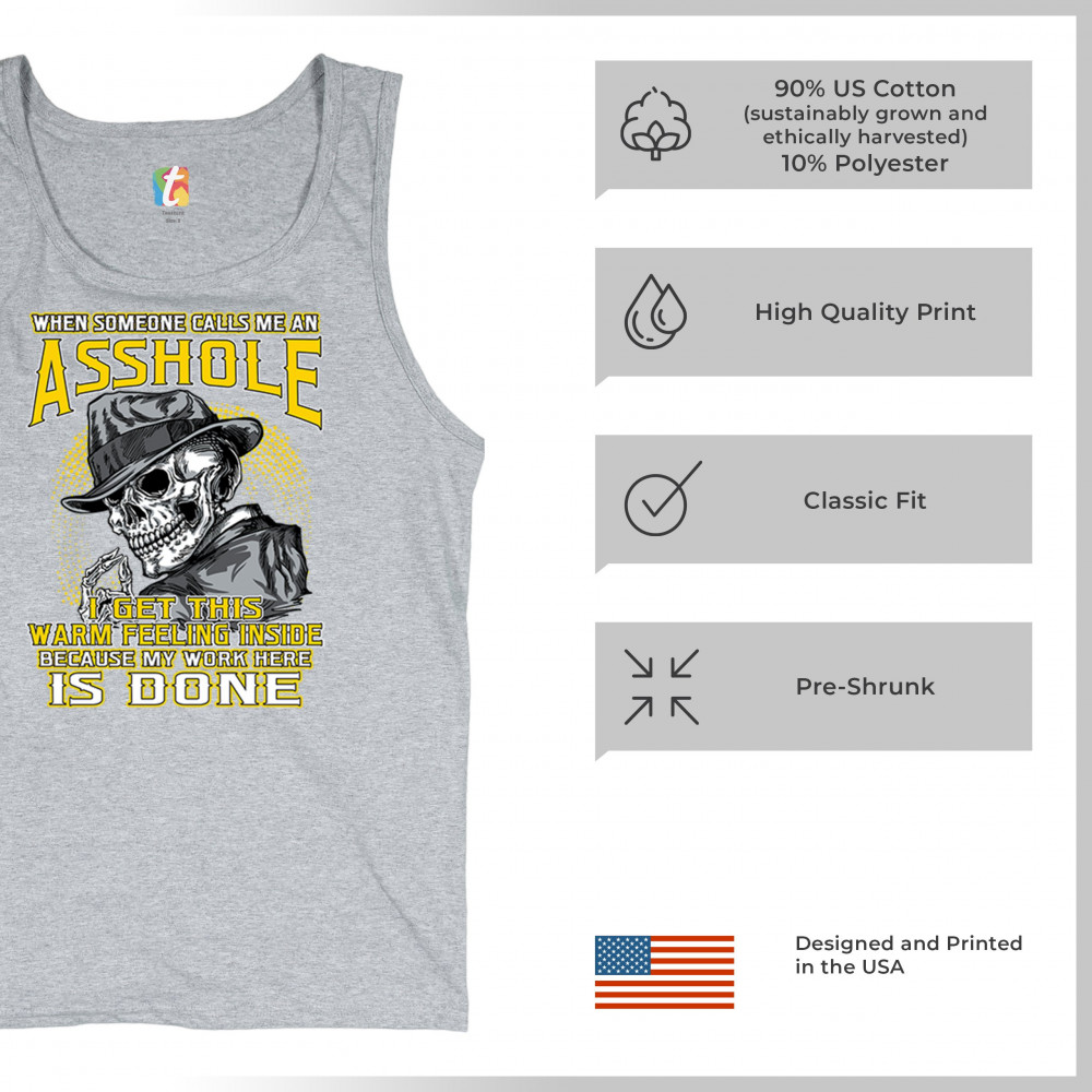 This badass design features a smirking skull in a fedora with a cigarette, backed by the line: “When someone calls me an asshole... my work here is done.†Built for dark humor fans, skull art lovers, and those who live life with sharp wit and zero regrets. Ideal for biker rallies, sarcasm nights, or anyone owning their attitude with pride.