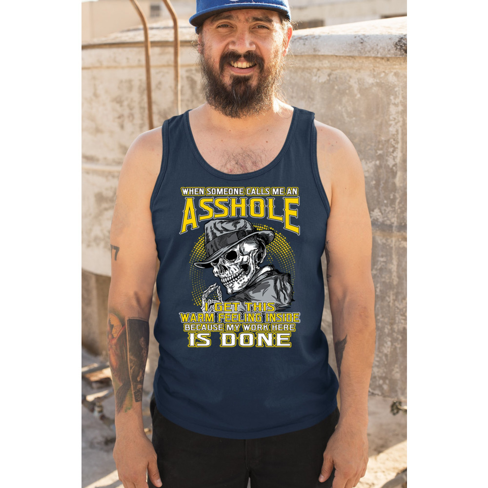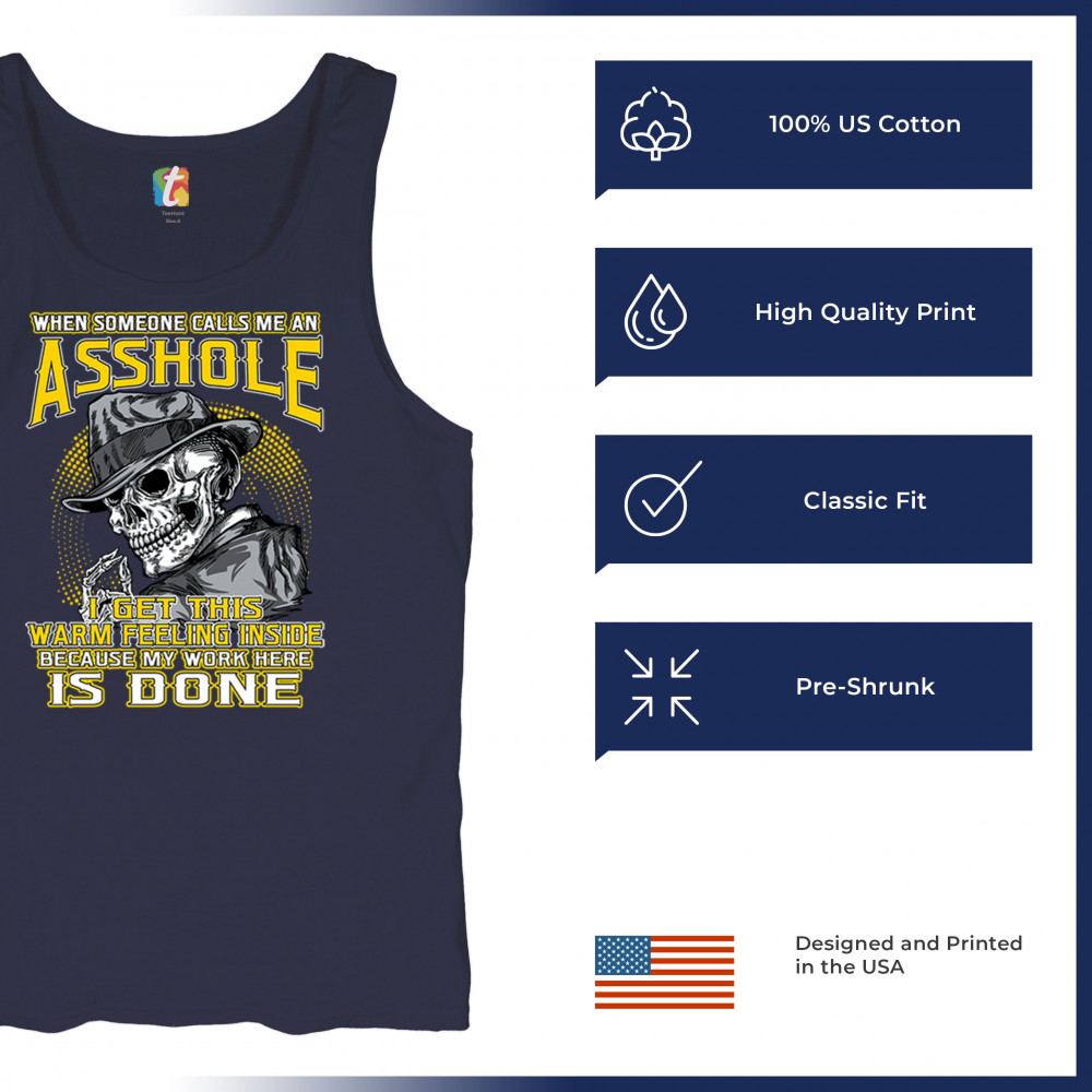 This badass design features a smirking skull in a fedora with a cigarette, backed by the line: “When someone calls me an asshole... my work here is done.†Built for dark humor fans, skull art lovers, and those who live life with sharp wit and zero regrets. Ideal for biker rallies, sarcasm nights, or anyone owning their attitude with pride.