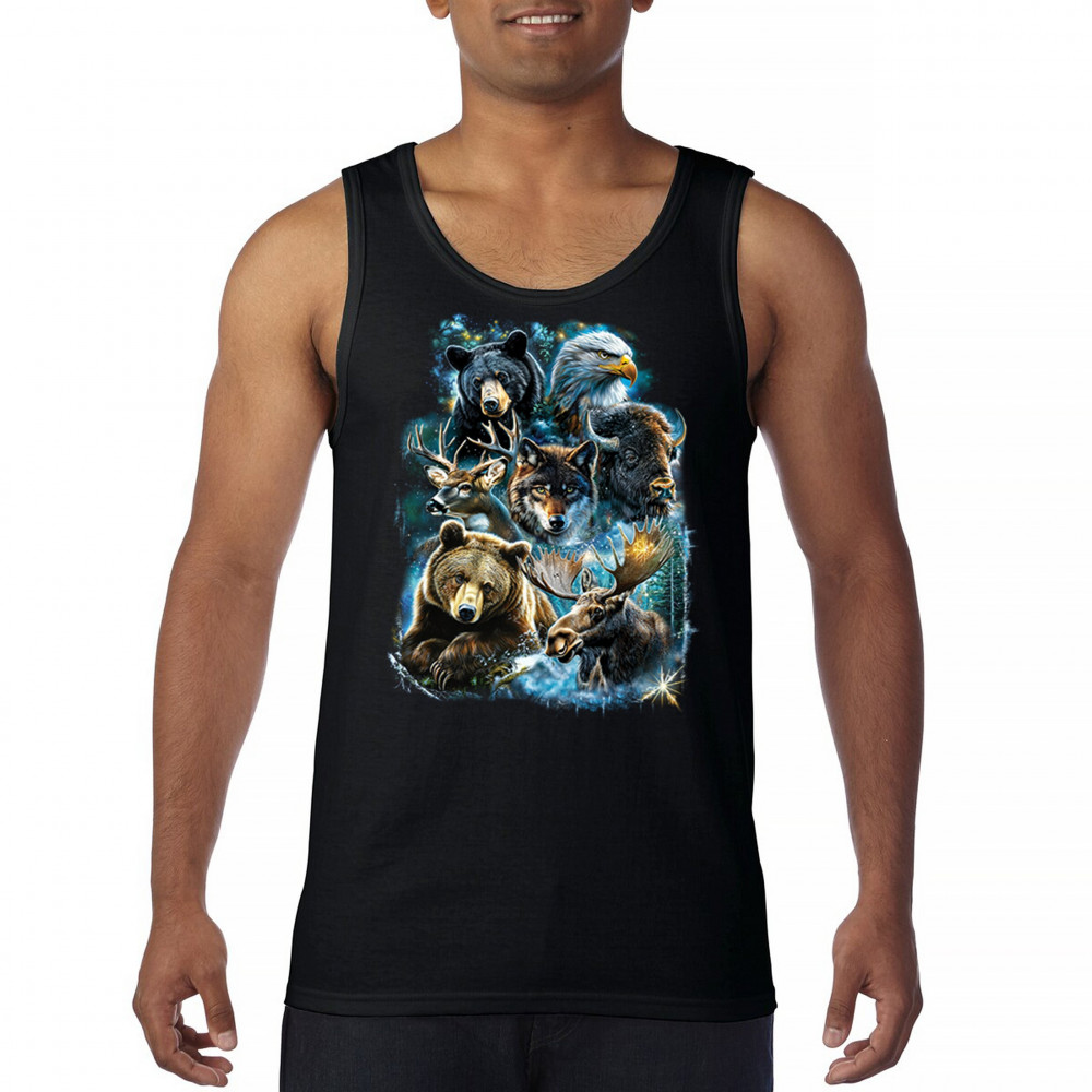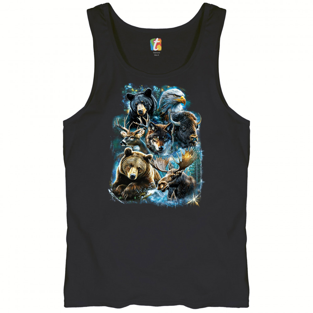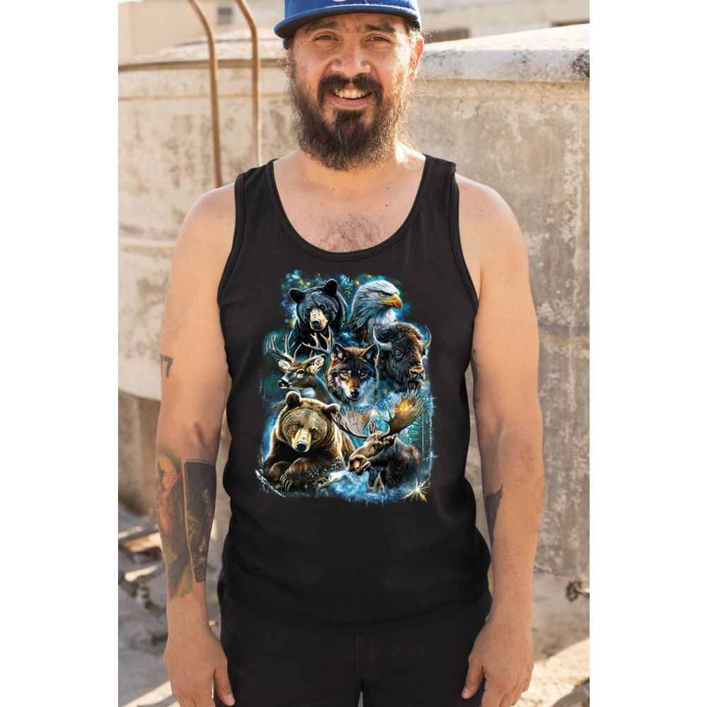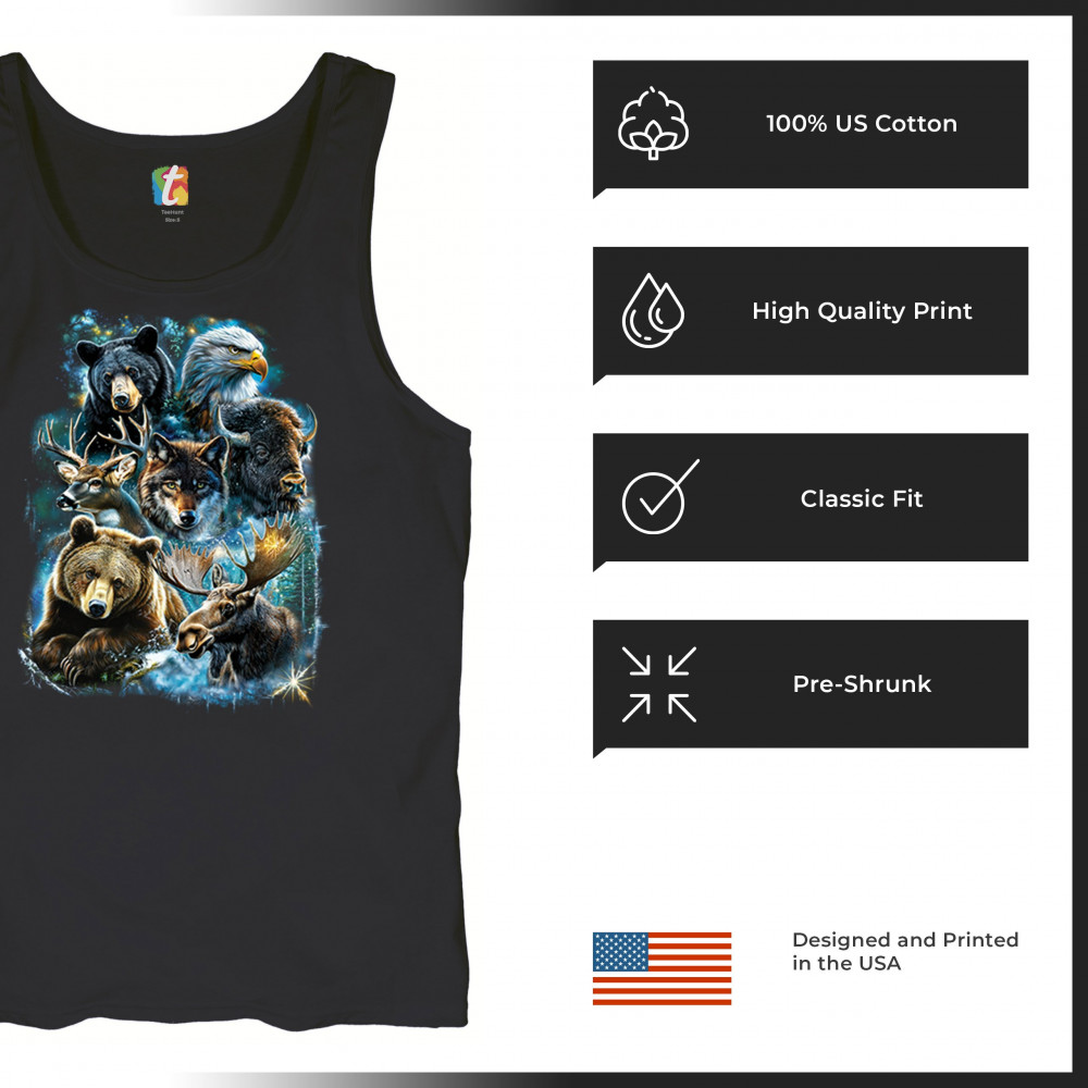 Wilderness design with moose, bear, eagle, bison, and wolf. A bold tribute to forest animals, nature strength, and rugged outdoor spirit.