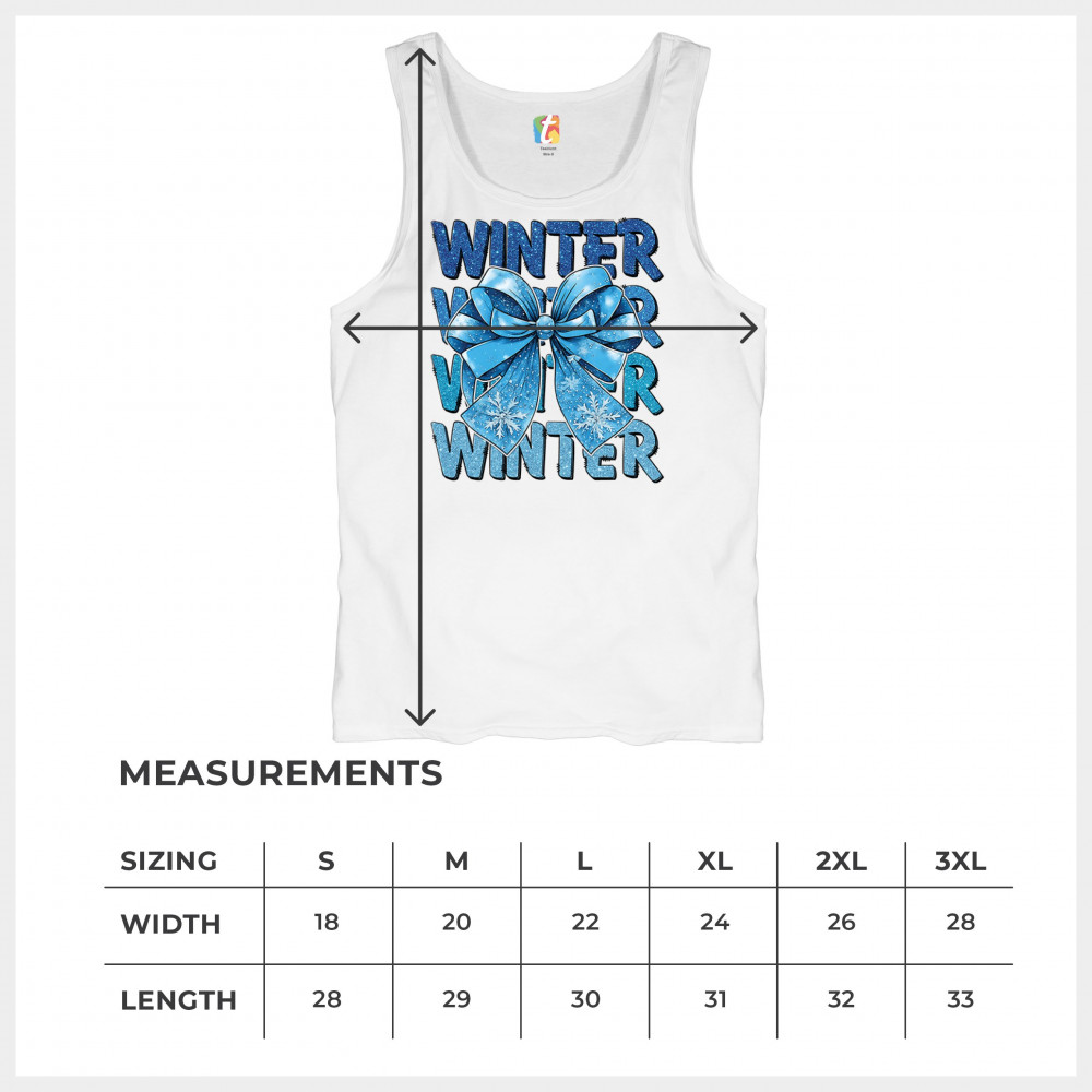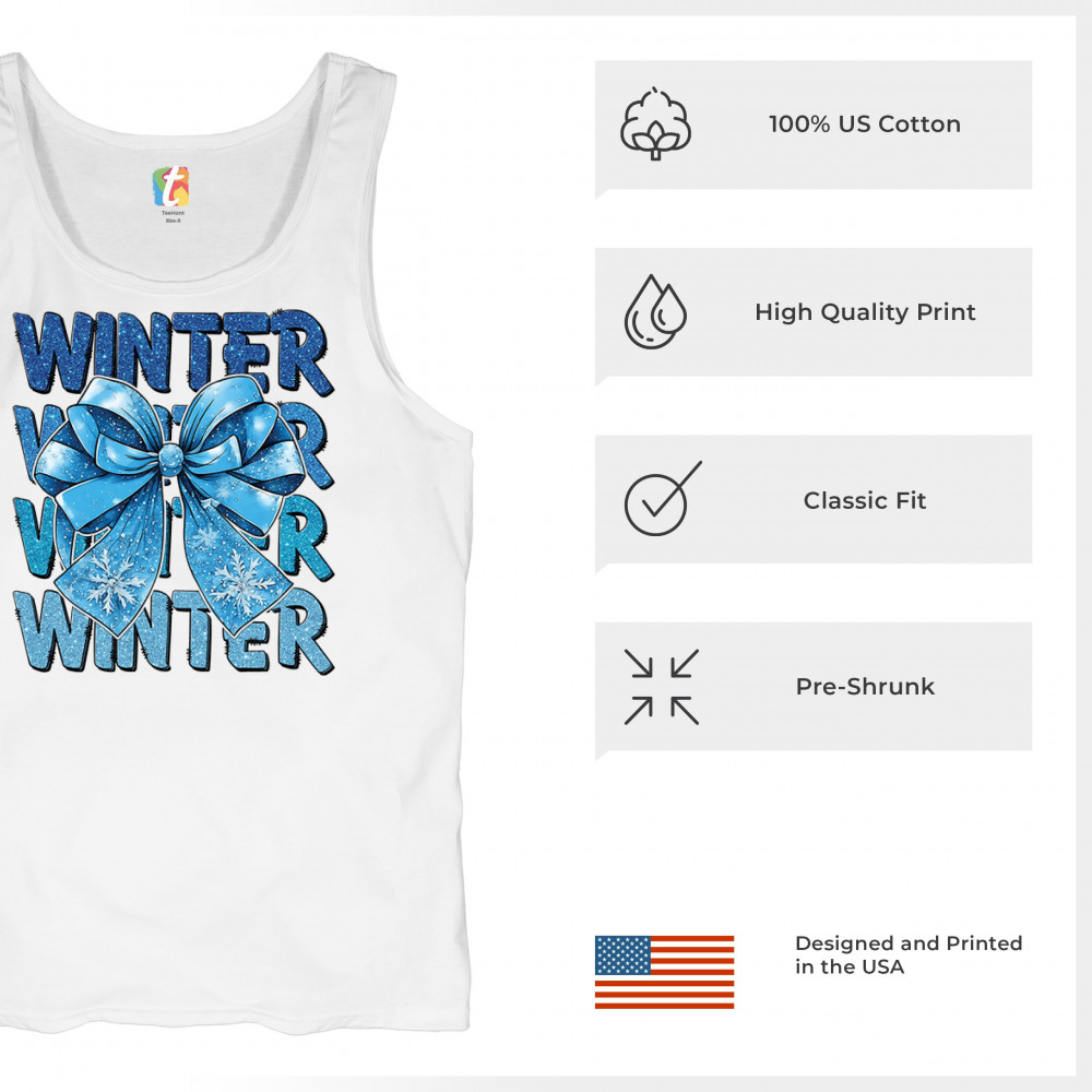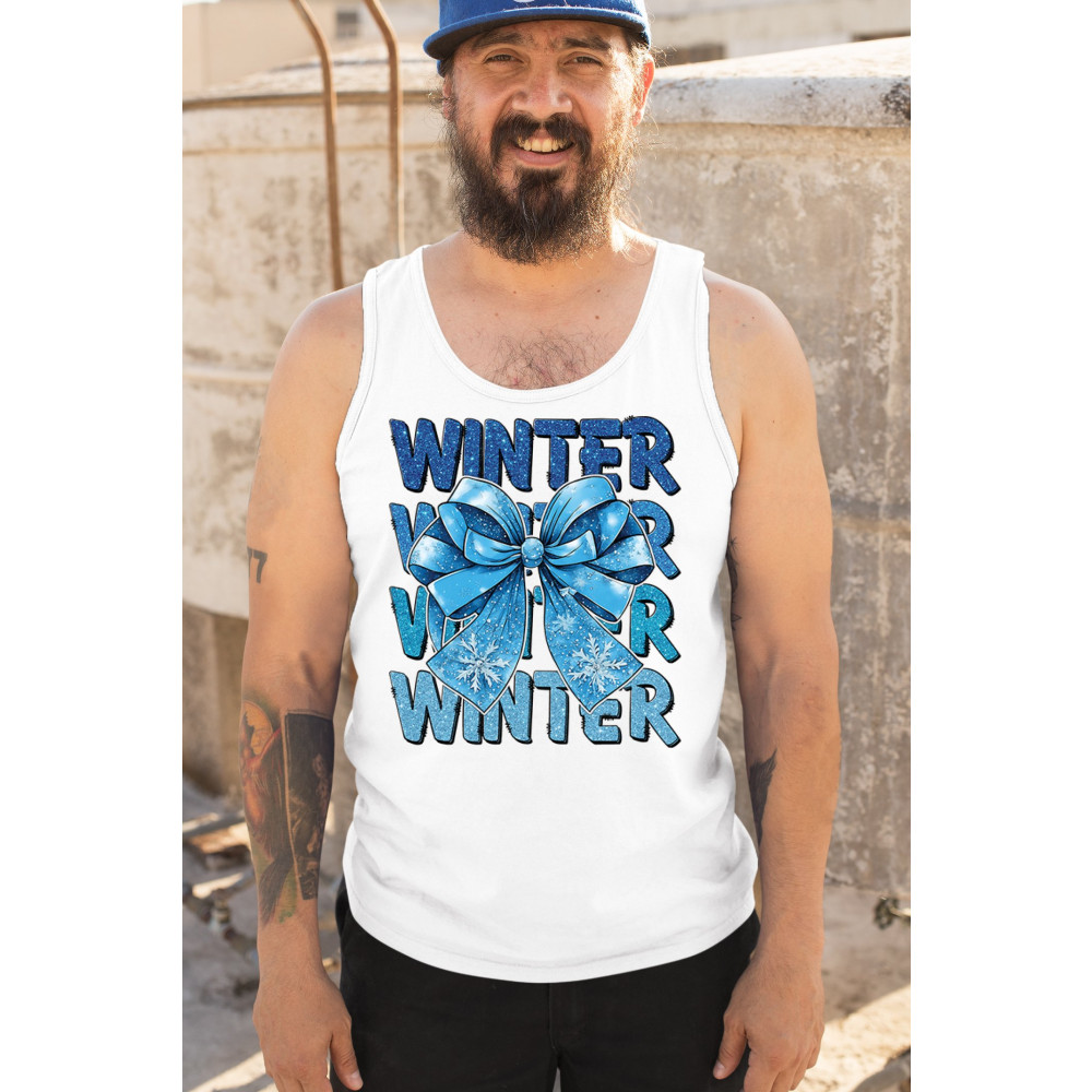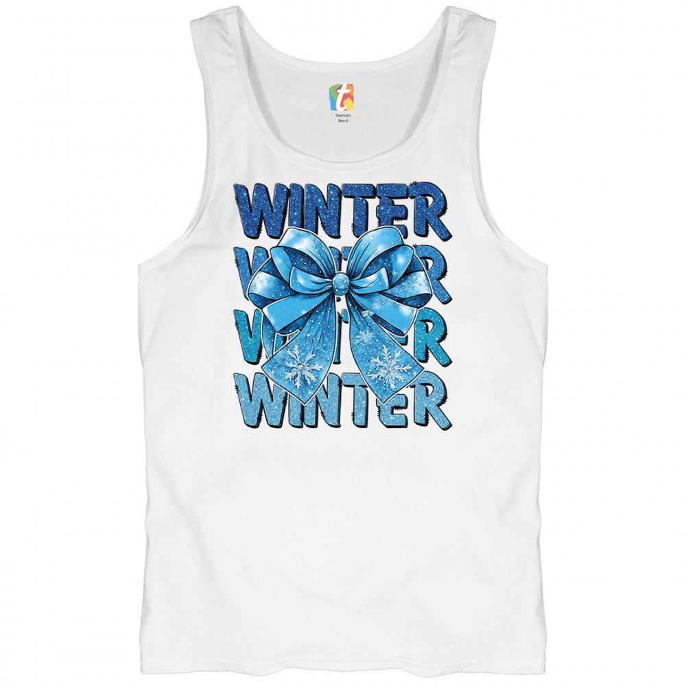 This shimmering winter bow design blends icy blue glitter style with bold repeating WINTER text for a bright seasonal statement. Snowflake accents and frosty tones create a cozy, cheerful vibe perfect for holiday outfits, gifting, or cold-weather lovers. A standout graphic that brings festive winter charm to any wardrobe and boosts seasonal search visibility.