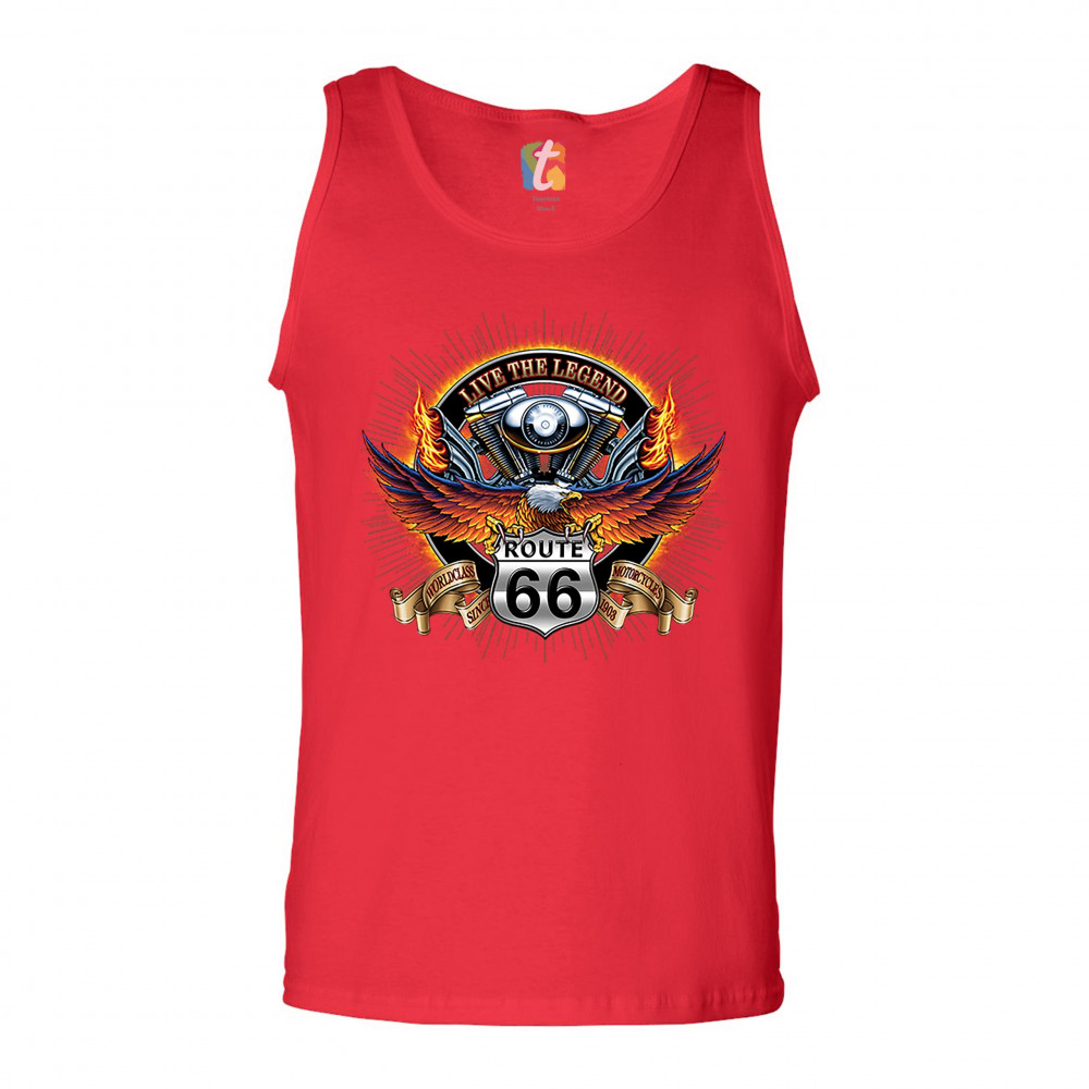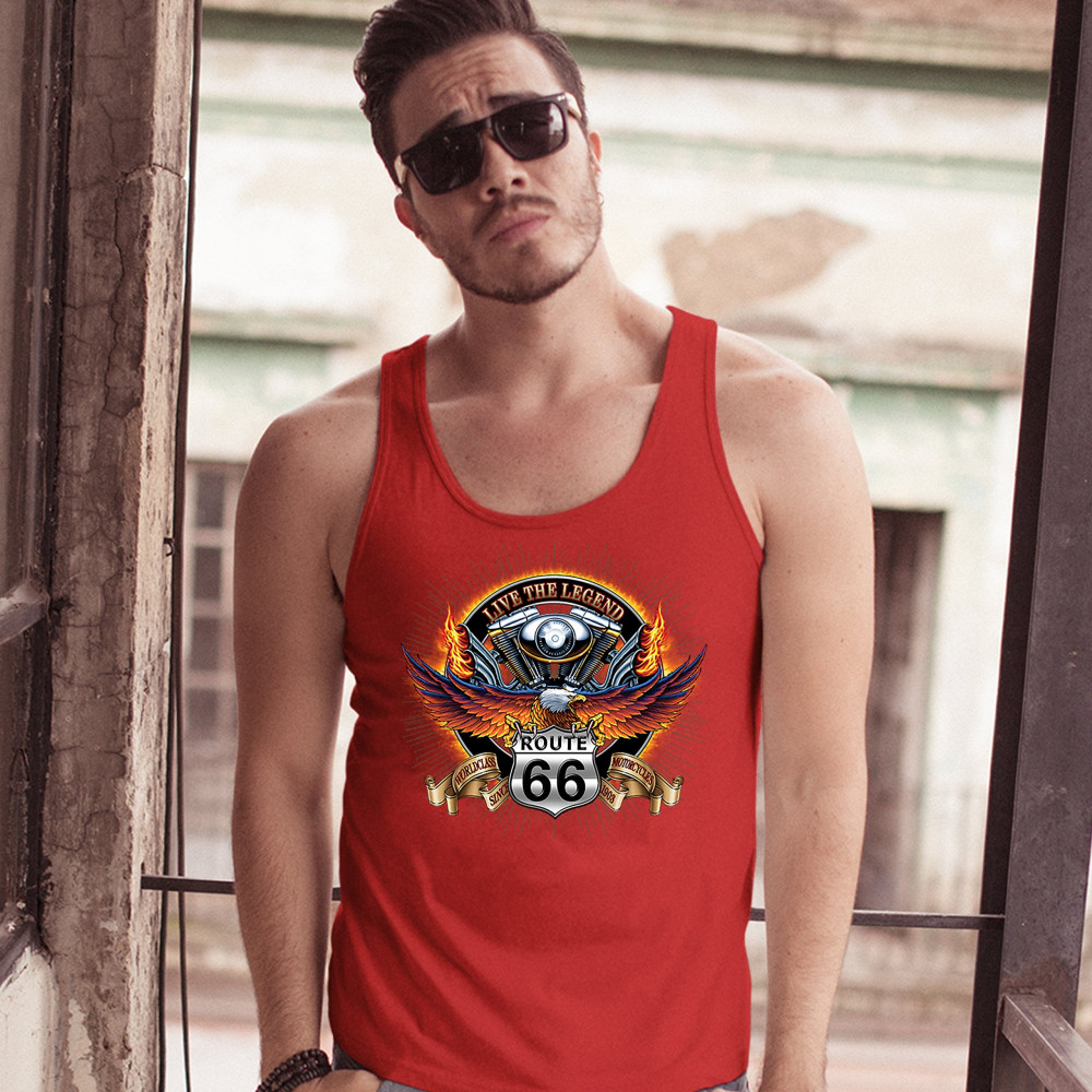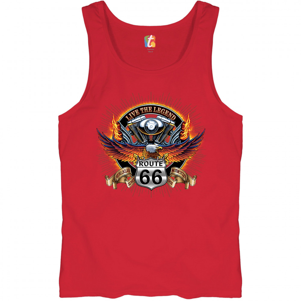 A print featuring an American bald eagle spreading it's wings while sitting on a "Route 66" sign. On a stripe behind the sign it says: "worldclass motorcycles since 1903". In the background there is a motorcycle engine with words: "live the legend" above