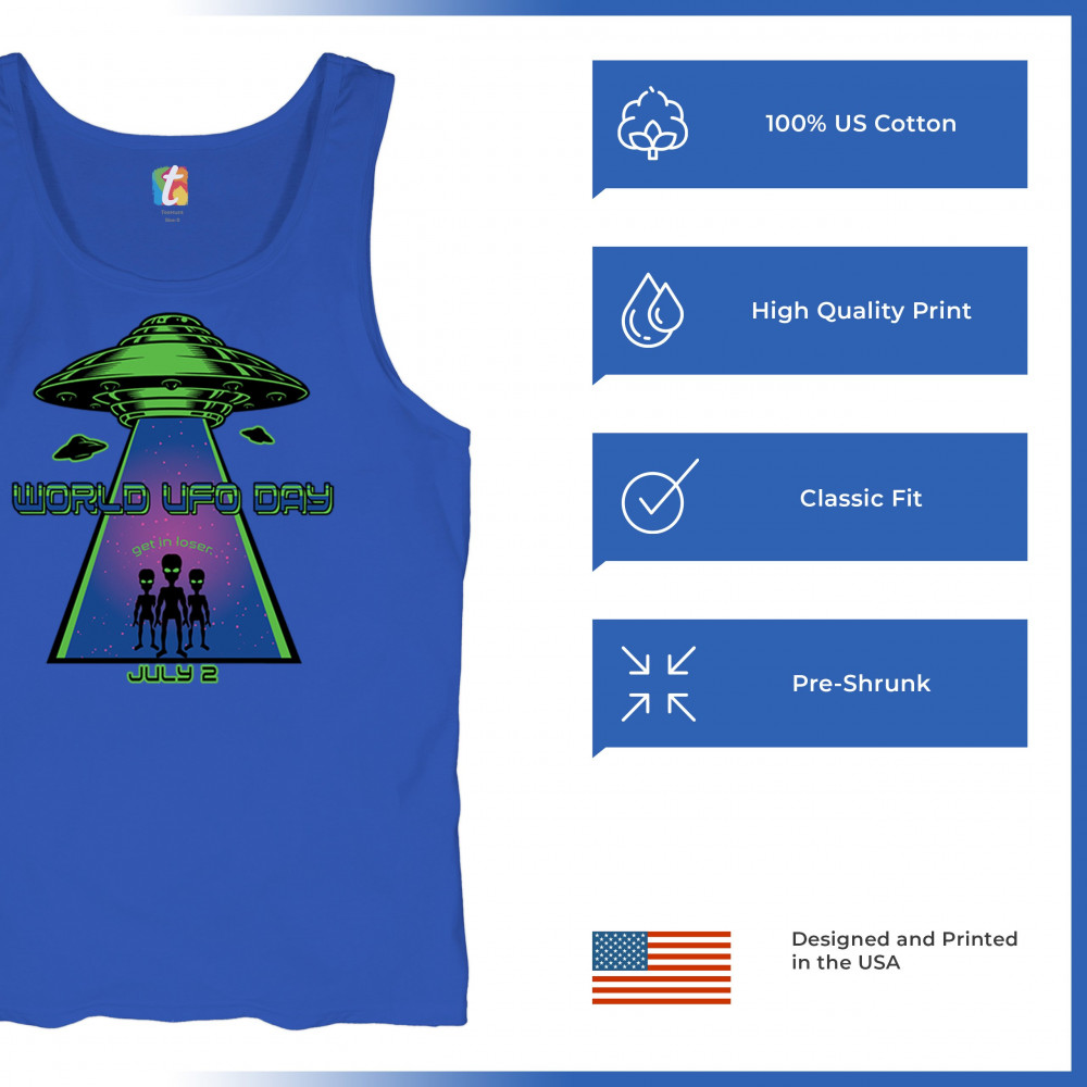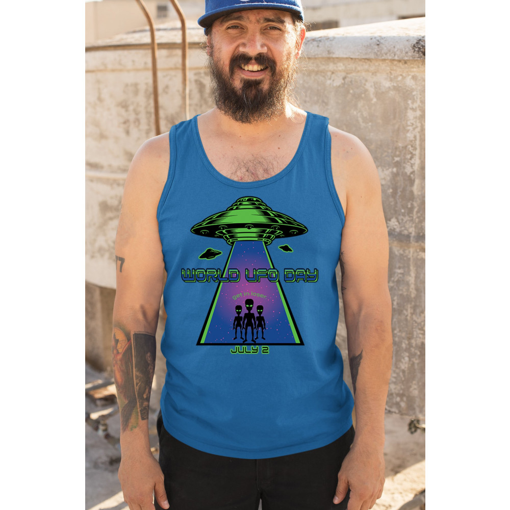Join the celebration of World UFO Day with this unique design, featuring a detailed UFO beaming up three cheerful aliens with the phrase "Get in, loser." Perfect for those who are fascinated by the unknown and have a sense of humor about extraterrestrial life. Whether you're attending a UFO event, meeting with fellow enthusiasts, or just want to express your quirky style, this design is a must-have. Embrace the spirit of curiosity and fun with this eye-catching design for July 2nd.