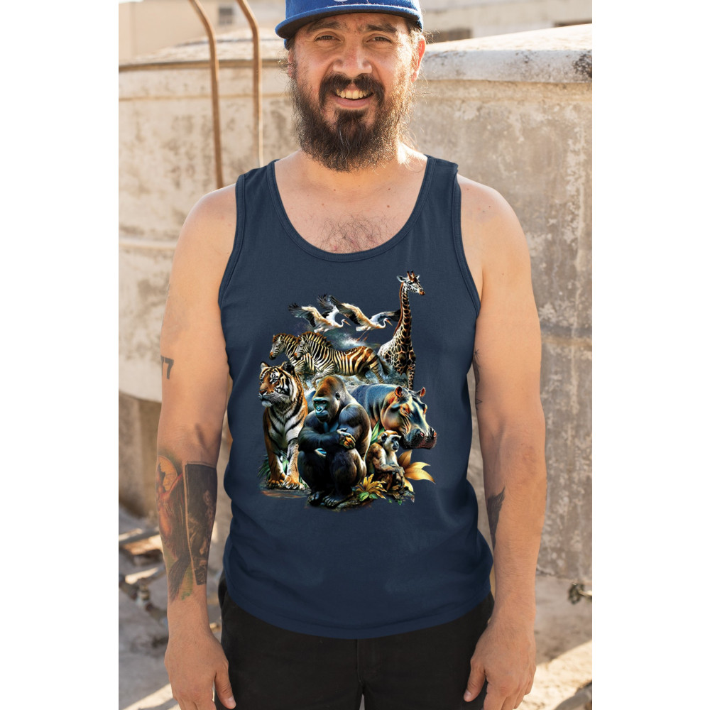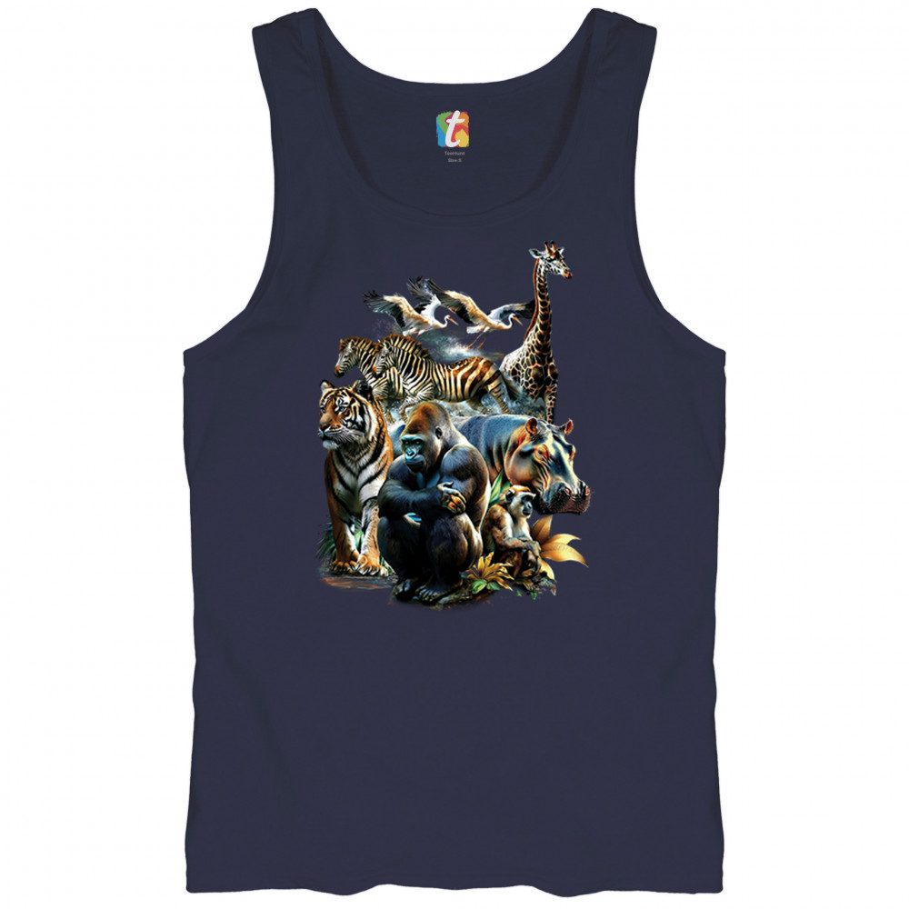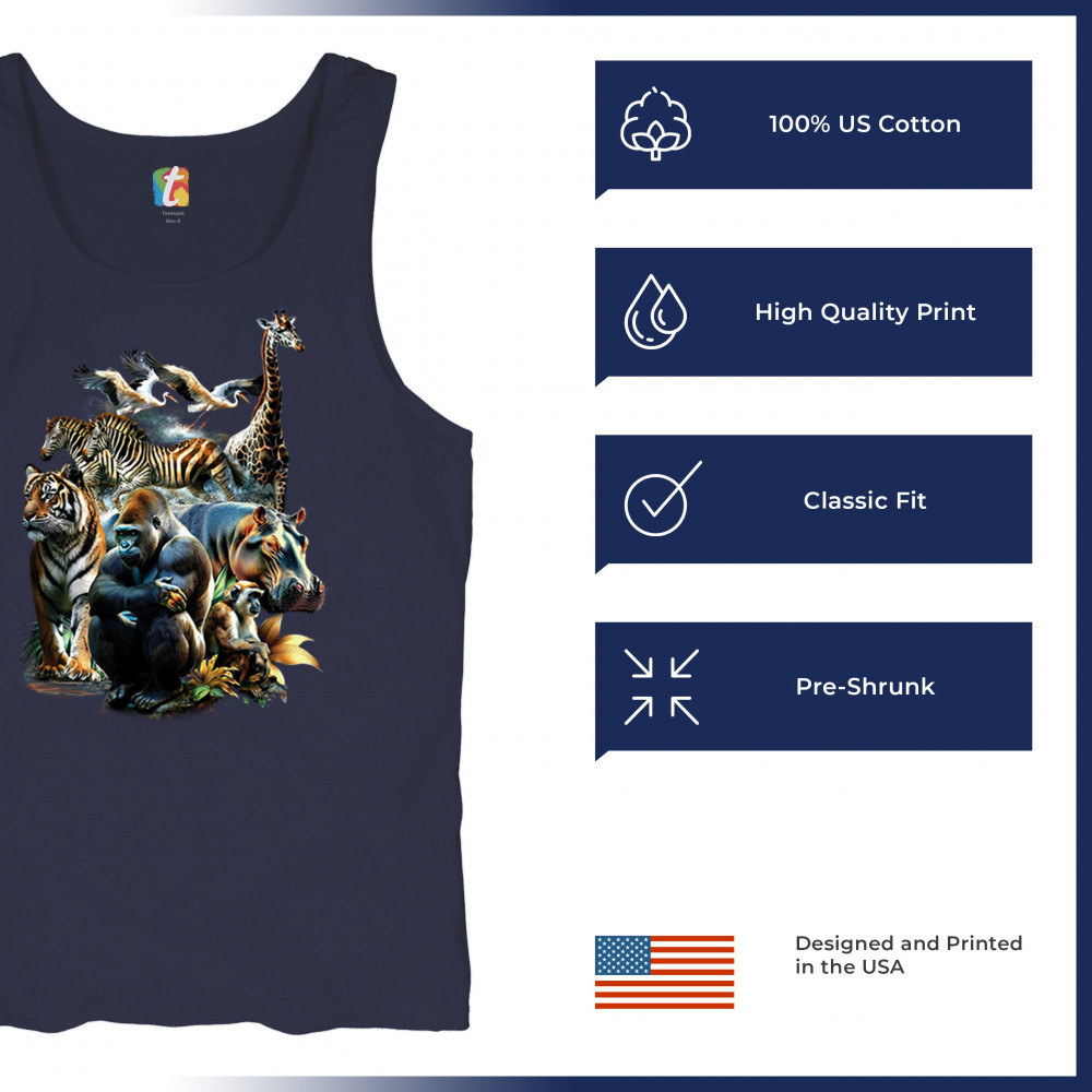 Packed with fierce energy and vibrant color, this wildlife design features a jungle coalition of gorilla, tiger, monkey, zebra, giraffe, hippo, and birds. A powerful tribute to animal beauty, biodiversity, and nature's harmony. Perfect for jungle tour enthusiasts, zoo visitors, or anyone passionate about wild conservation and stunning creature art.