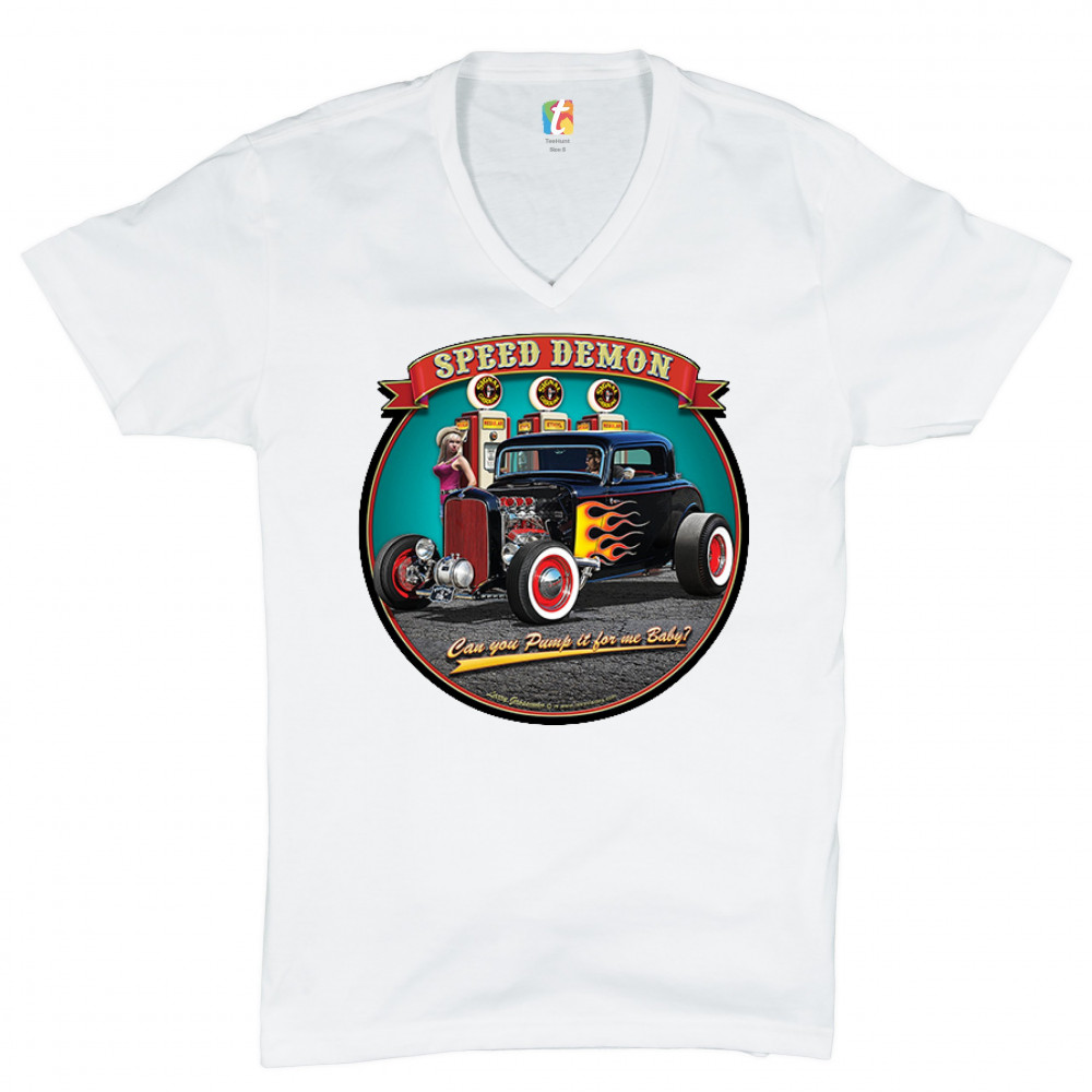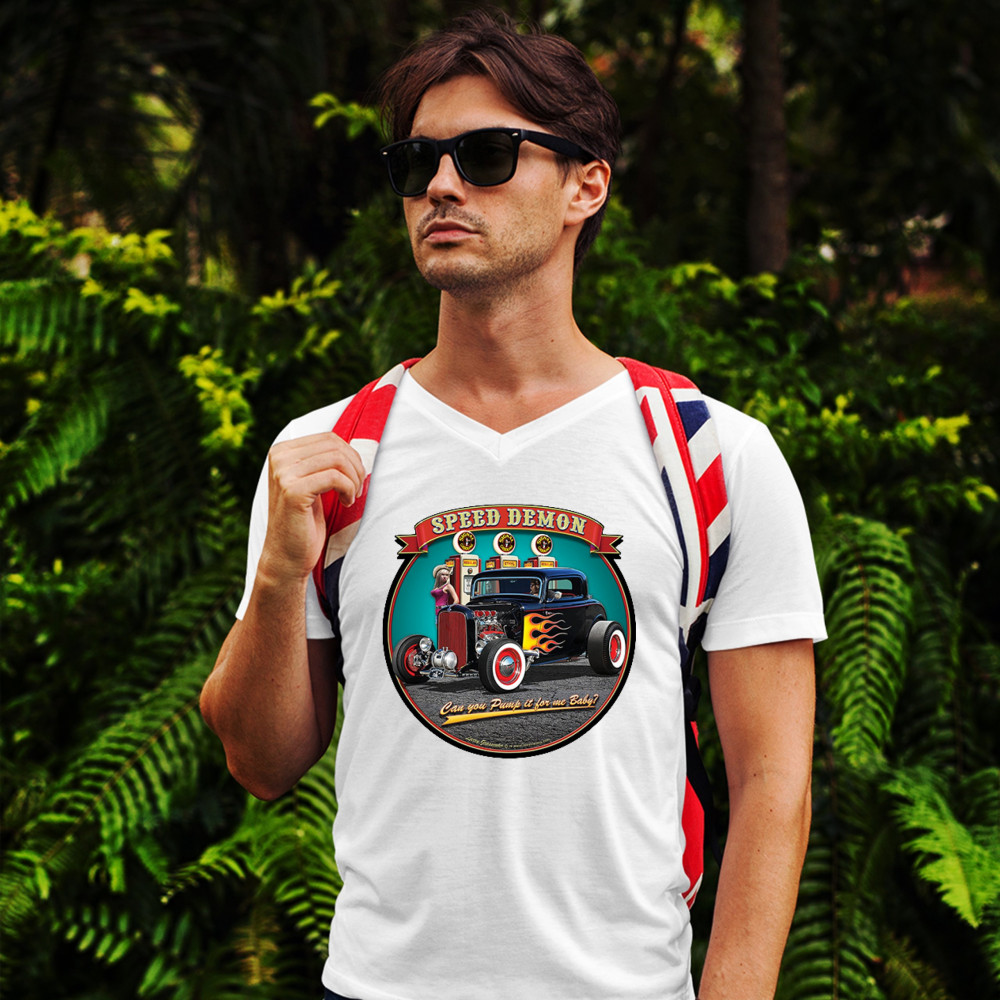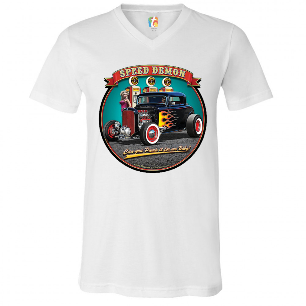 A print featuring a 1932 Ford Deuce hot rod coupe standing by a gas station. There is a cowgirl leaning on a gas pump. The print says: "speed demon" and underneath the car "Can you Pump it for me baby?". A great choice for Route 66 and hot rod fans.