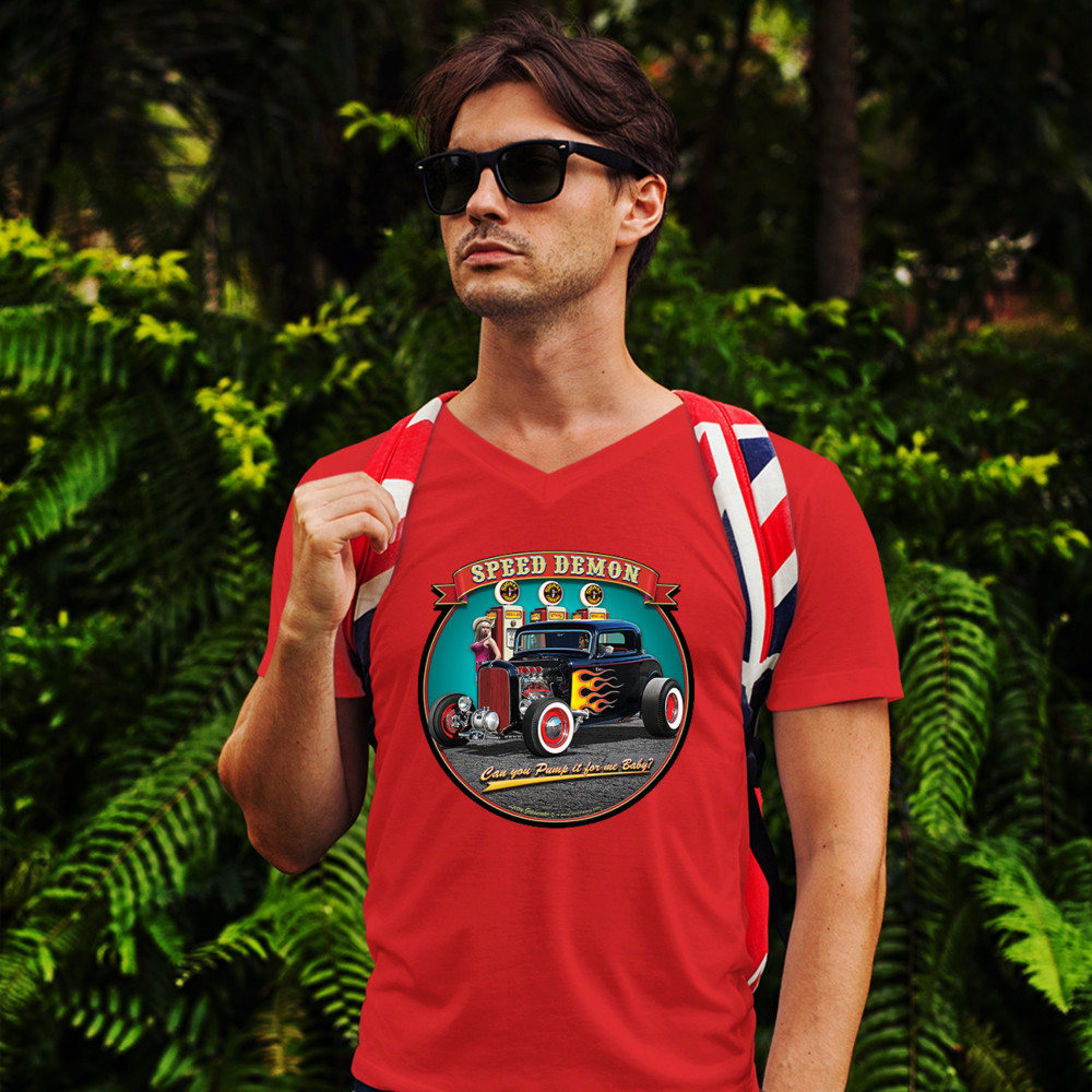 A print featuring a 1932 Ford Deuce hot rod coupe standing by a gas station. There is a cowgirl leaning on a gas pump. The print says: "speed demon" and underneath the car "Can you Pump it for me baby?". A great choice for Route 66 and hot rod fans.