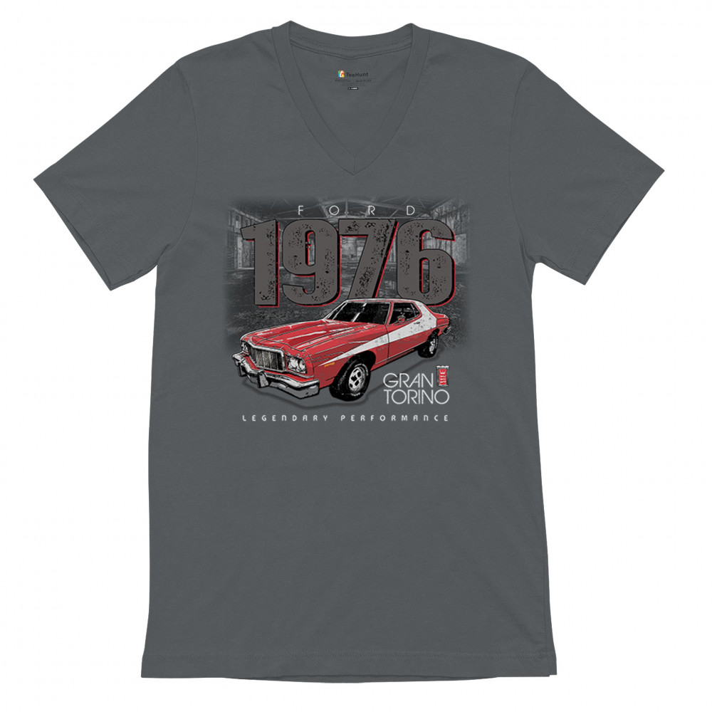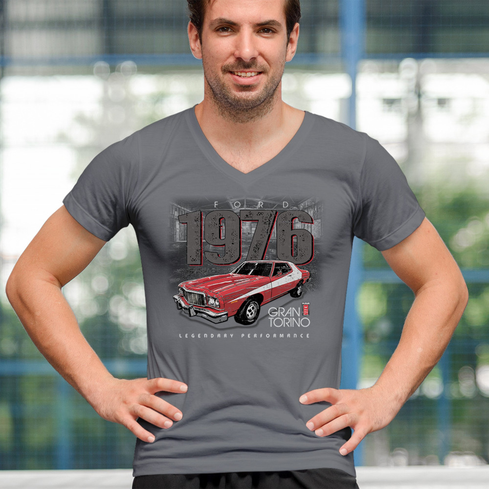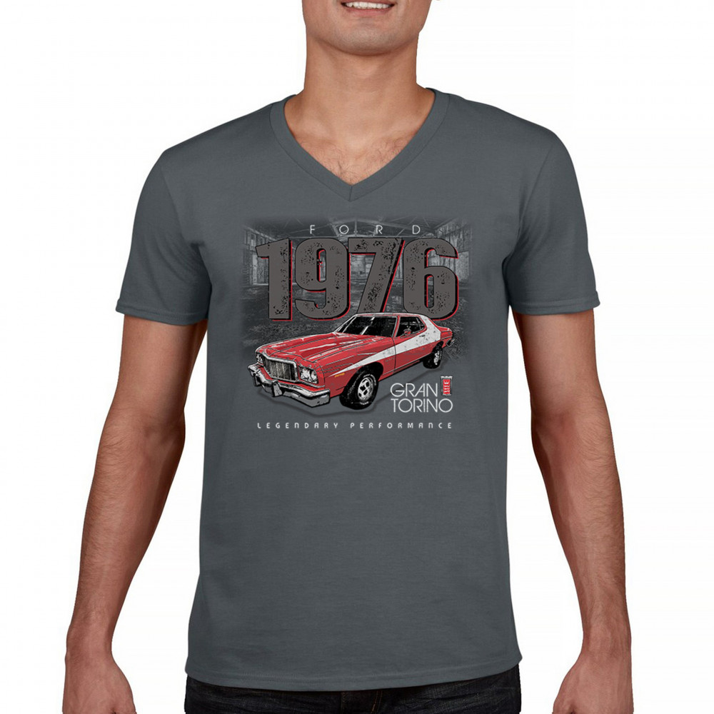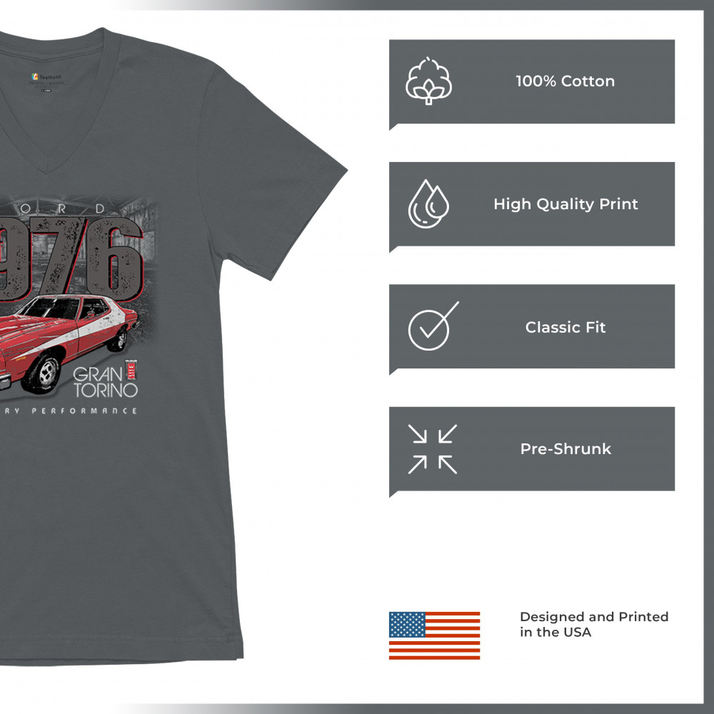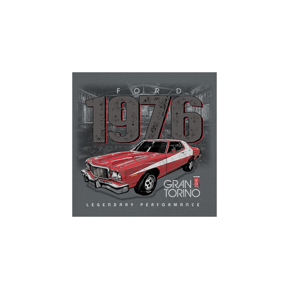 1976 Ford Gran Torino design with red and white retro style. Perfect for muscle car fans, Ford lovers, and classic car event gear.