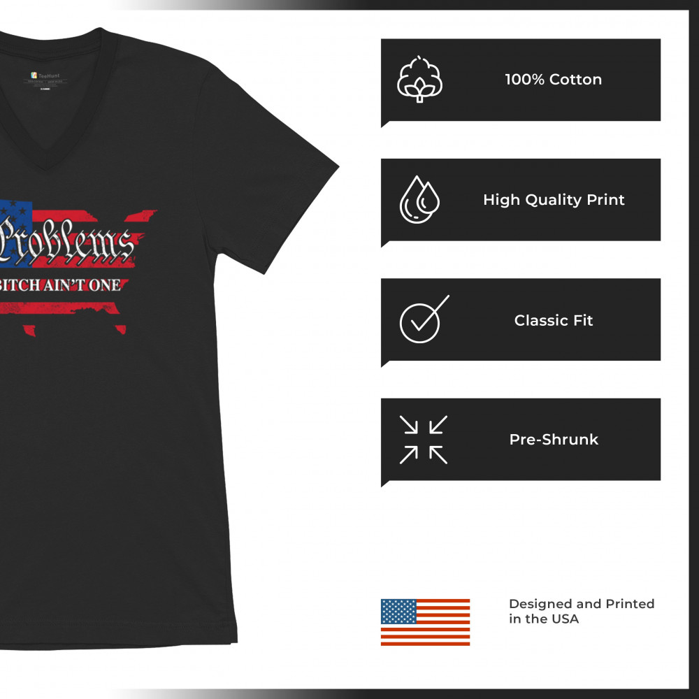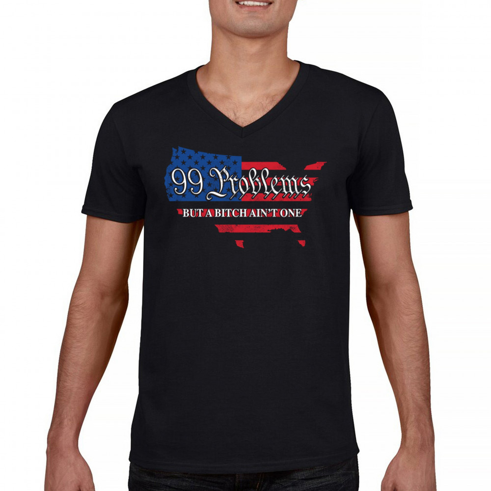 Embrace your patriotic spirit with this striking "99 Problems But a B*tch Ain't One" design, blending the American map and flag-inspired elements. Perfect for Trump supporters, conservatives, and all who believe in the values of freedom, victory, and the Republican Red Wave. Celebrate your commitment to America and make a statement that reflects your unwavering belief in the people's mandate and the party of common sense.