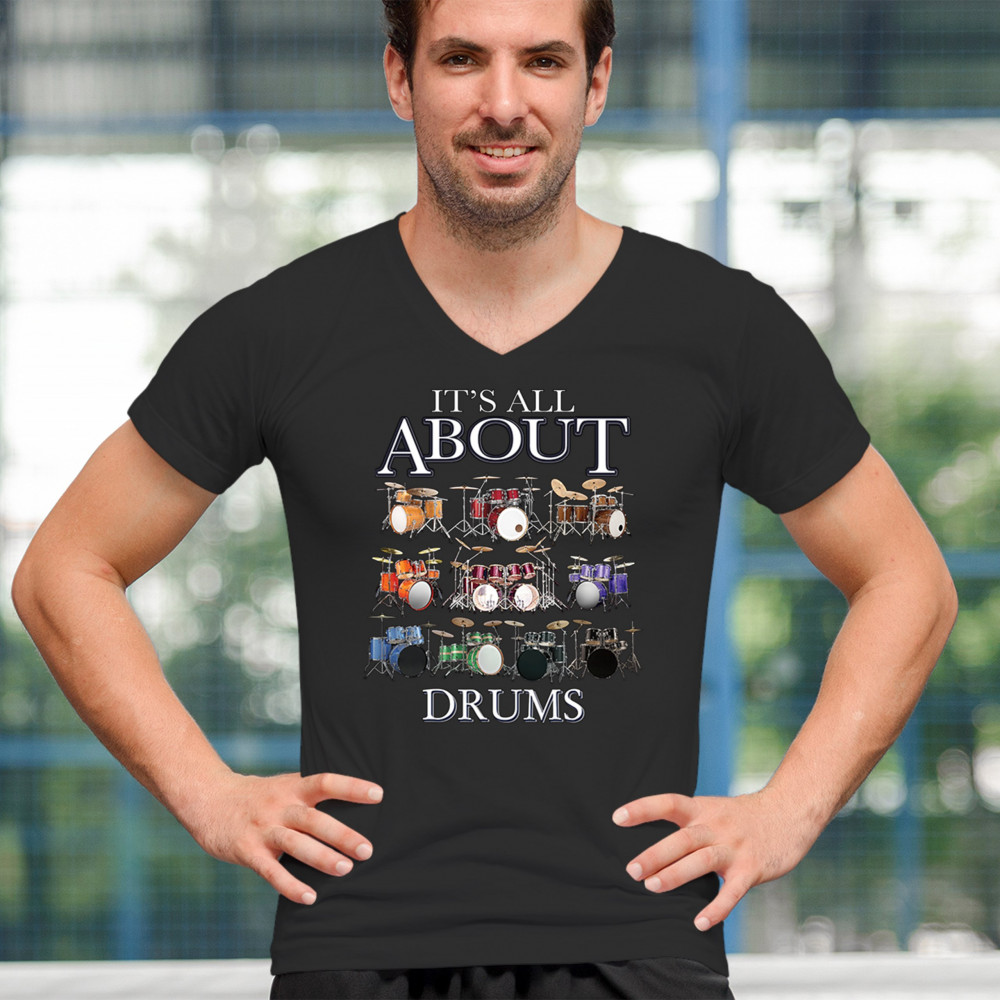 ALL ABOUT DRUMS v-neck t-shirt colorful funny drummer music festival party tee black