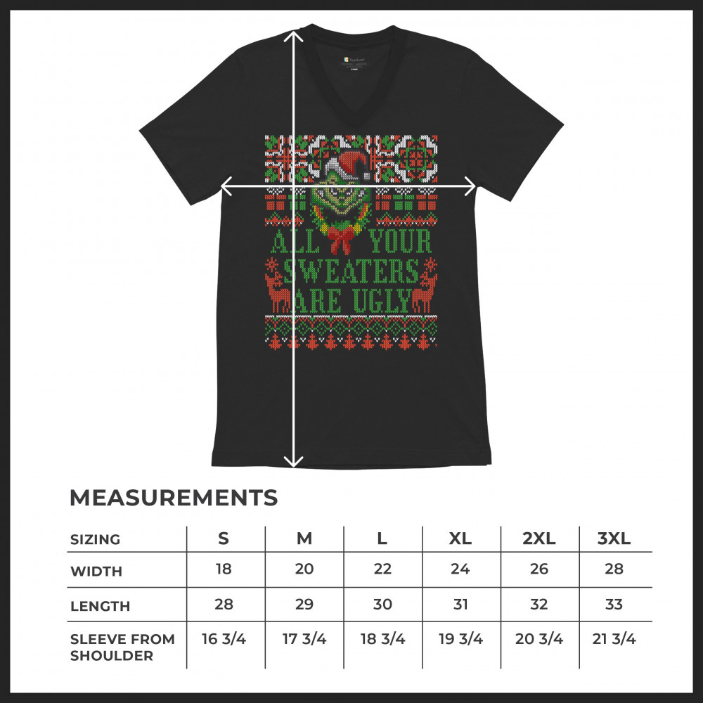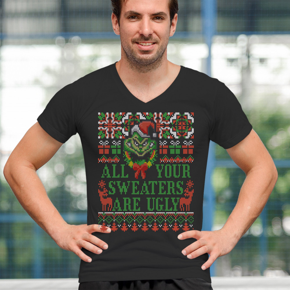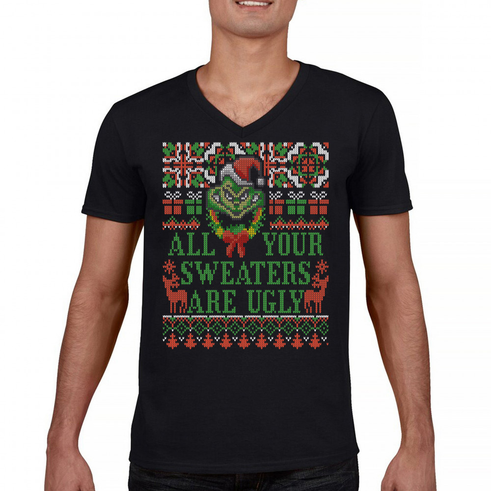 ALL YOUR SWEATERS ARE UGLY v-neck t-shirt funny merry christmas rudolph tee black