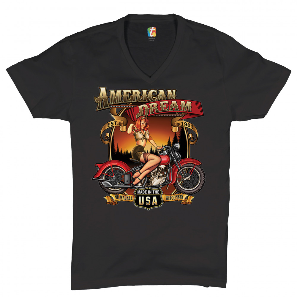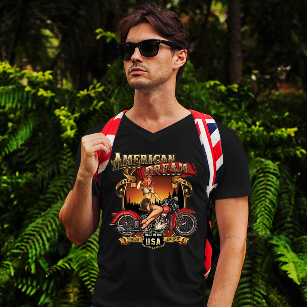 A print featuring a sexy pin up girl sitting on a vintage motorcycle. The print says: "American Dream est. 1903". In the bottom there is a sign saying: "made in the USA". To the left and right of it "Milwaukee Wisconsin" is written on a stripe. Great choice for any motorcycle enthusiast.