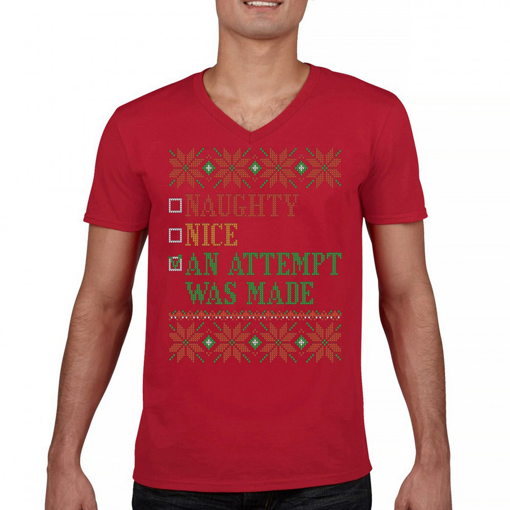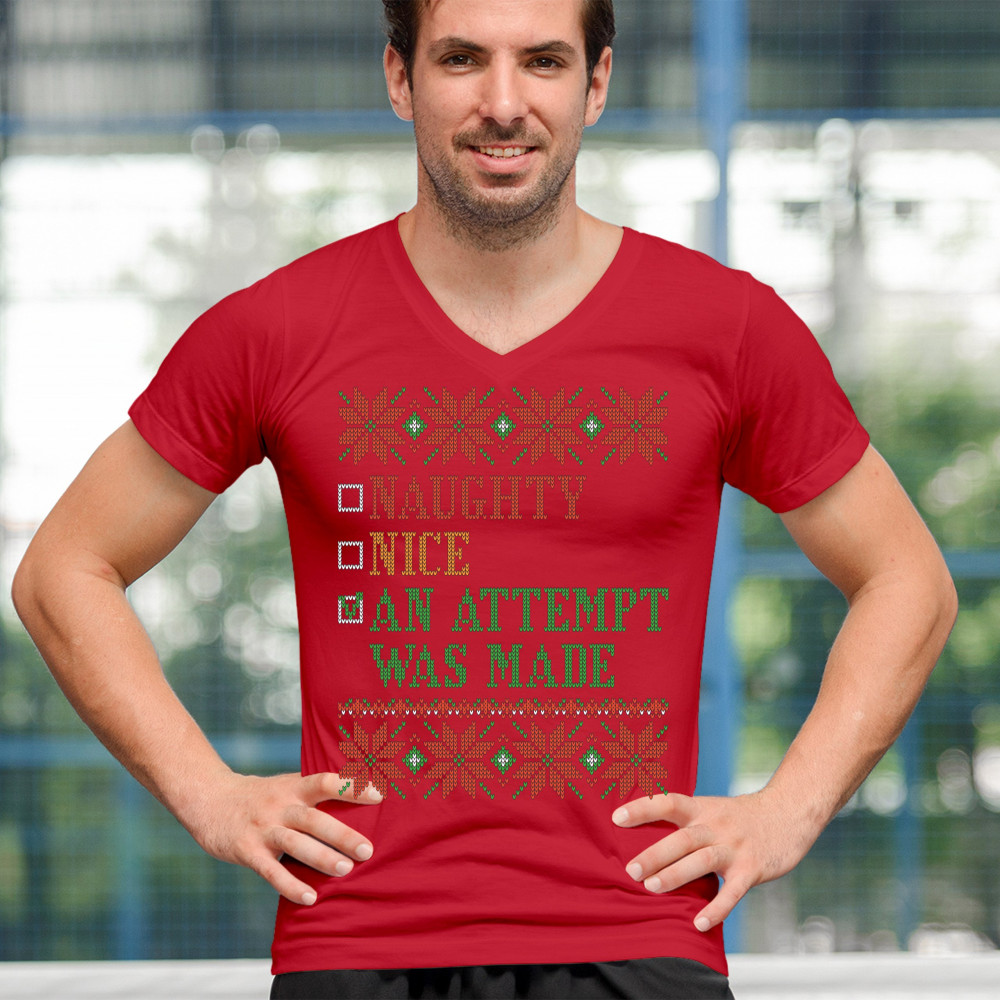 AN ATTEMPT WAS MADE v-neck t-shirt ugly sweater naughty or nice christmas tee red