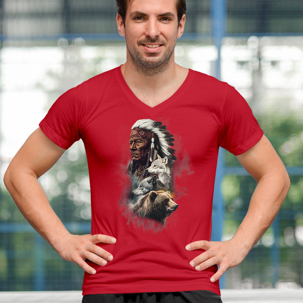 Tribal design with Native elder, wolves, and bear. A spiritual tribute to strength, wisdom, and guardianship in forest spirit symbolism.