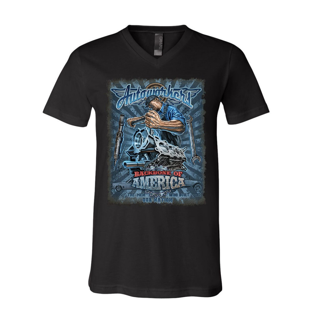 AUTOWORKERS - BACKBONE OF AMERICA autoworkers backbone of america v-neck t-shirt car motor mechanic union tee black