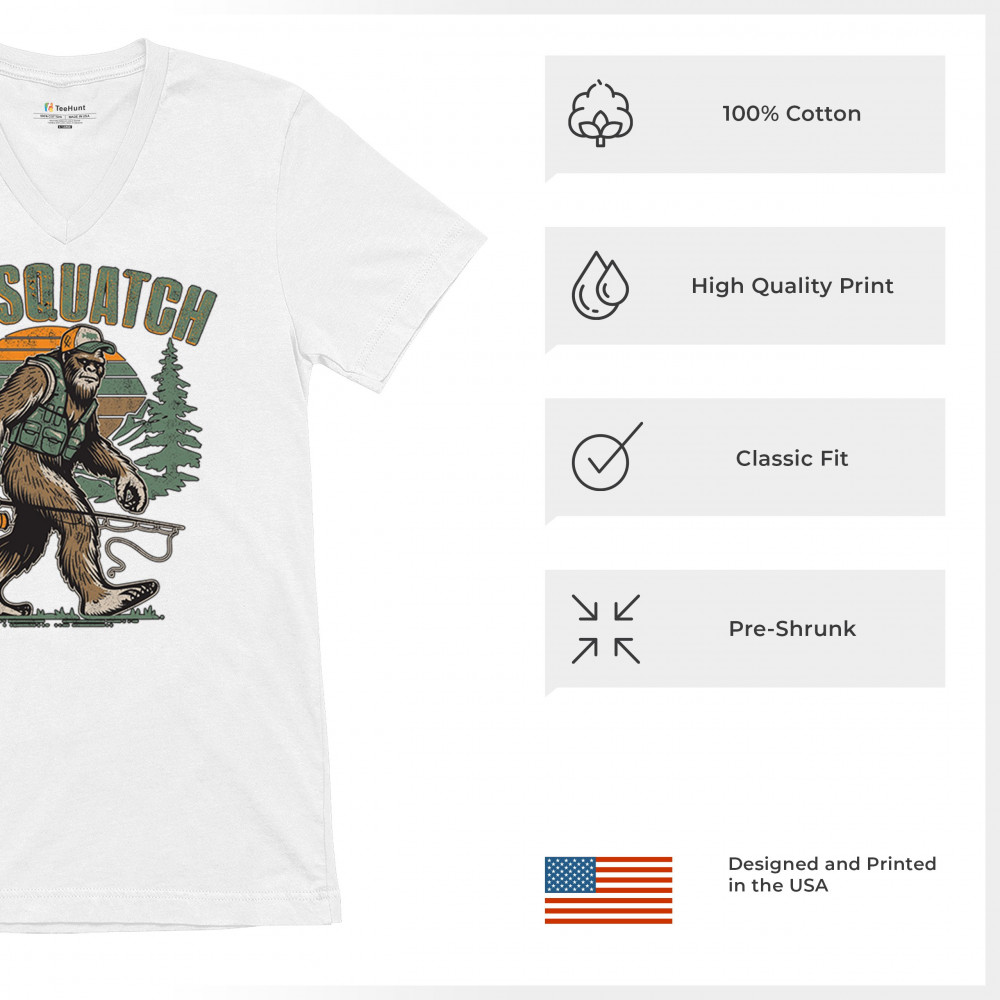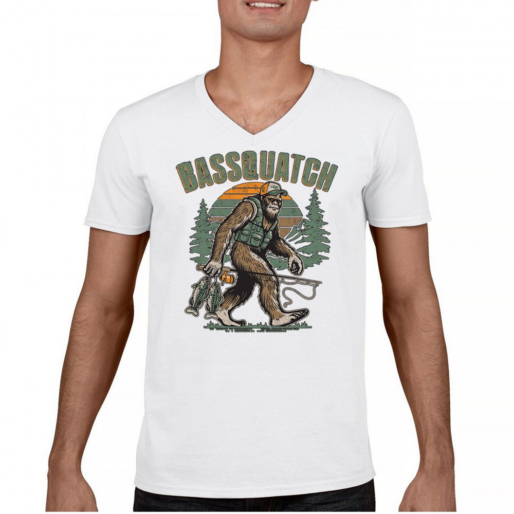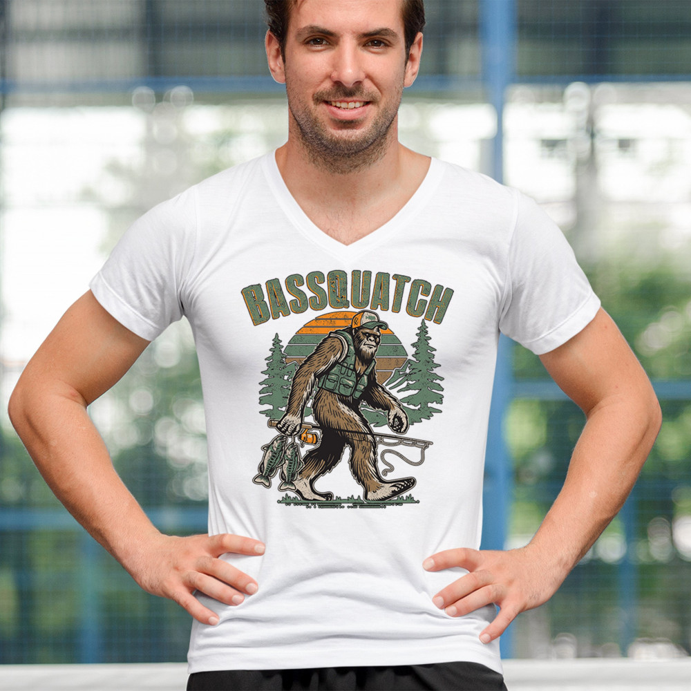 Funny Bassquatch design blends Bigfoot, fishing humor, and retro forest style. Great for anglers, cryptid lovers, and outdoorsy pun fans.