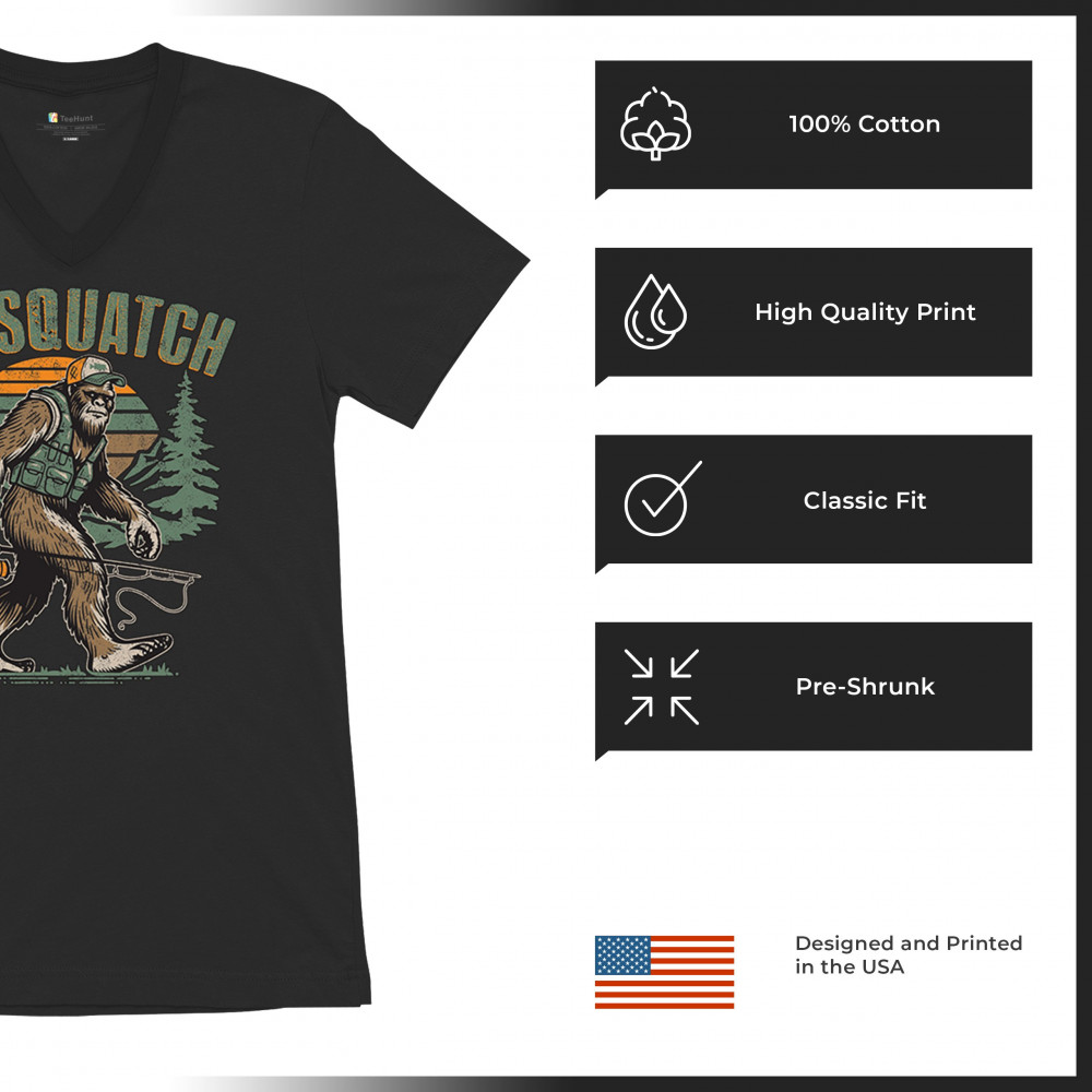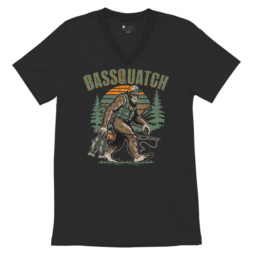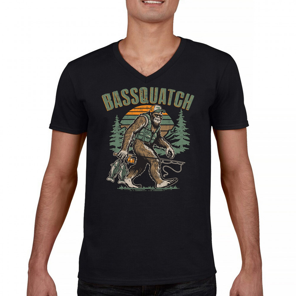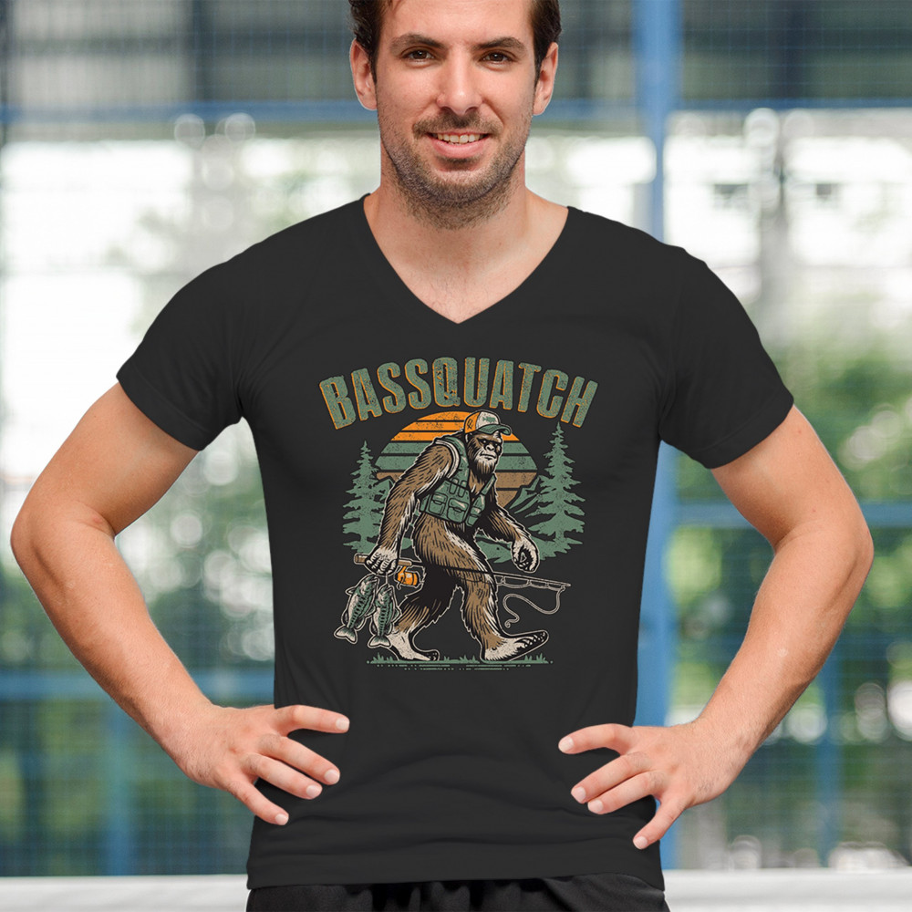 Funny Bassquatch design blends Bigfoot, fishing humor, and retro forest style. Great for anglers, cryptid lovers, and outdoorsy pun fans.