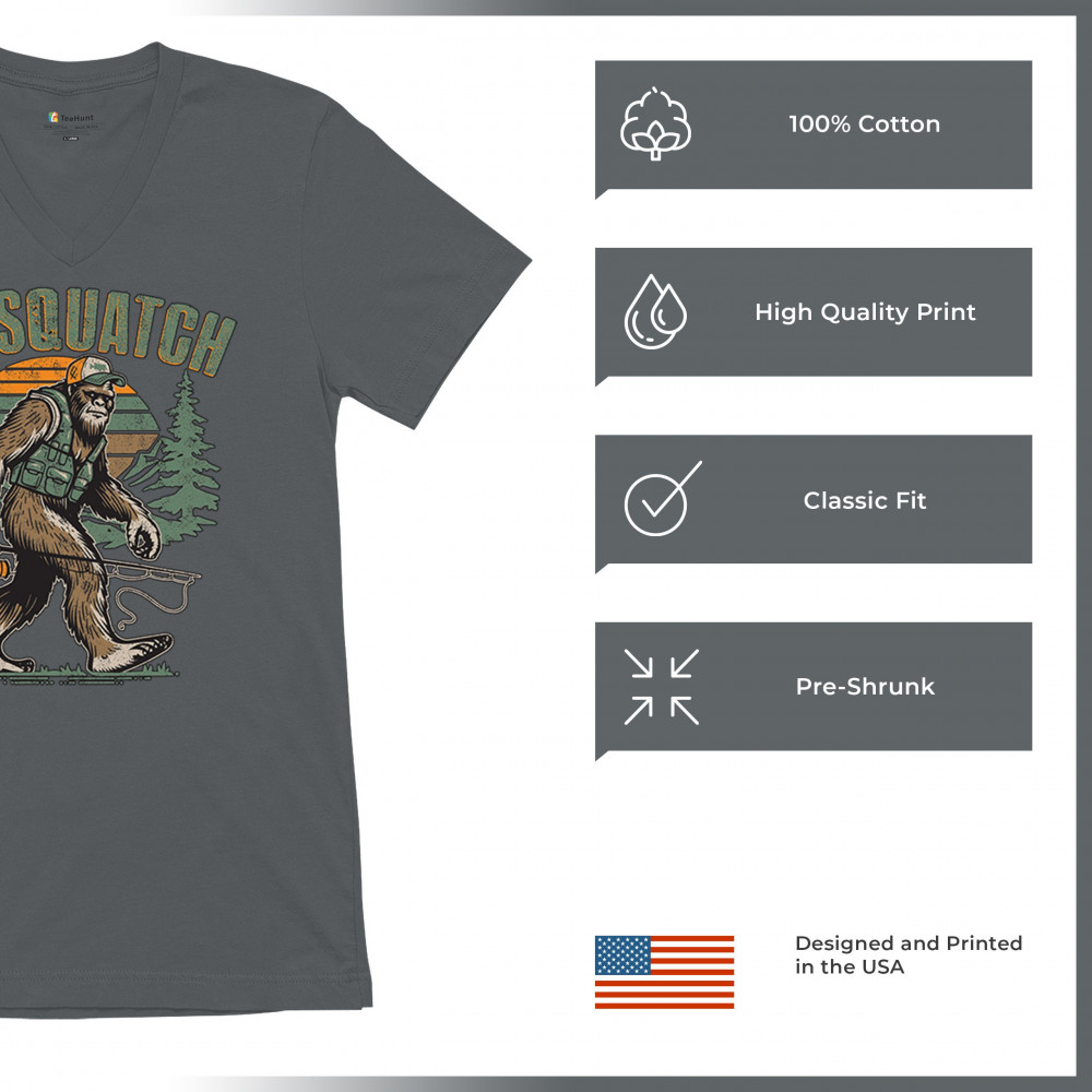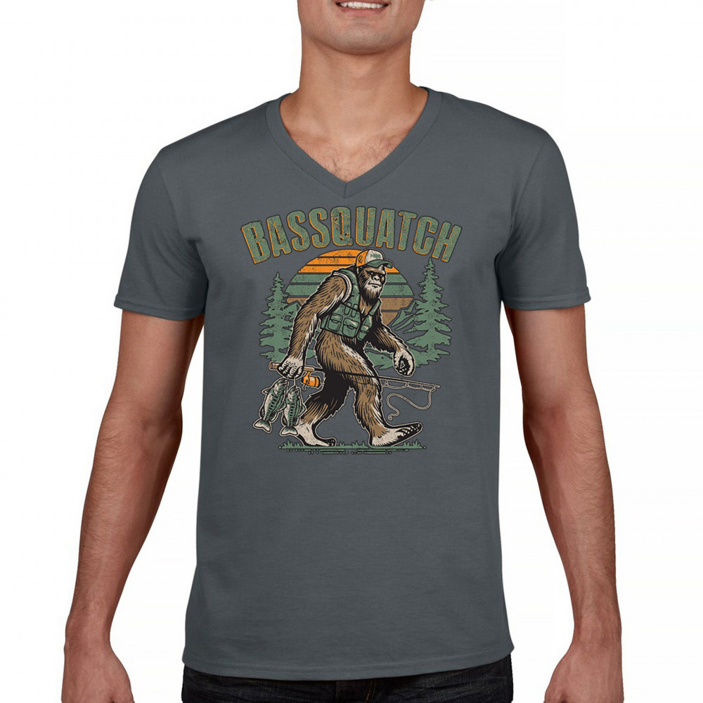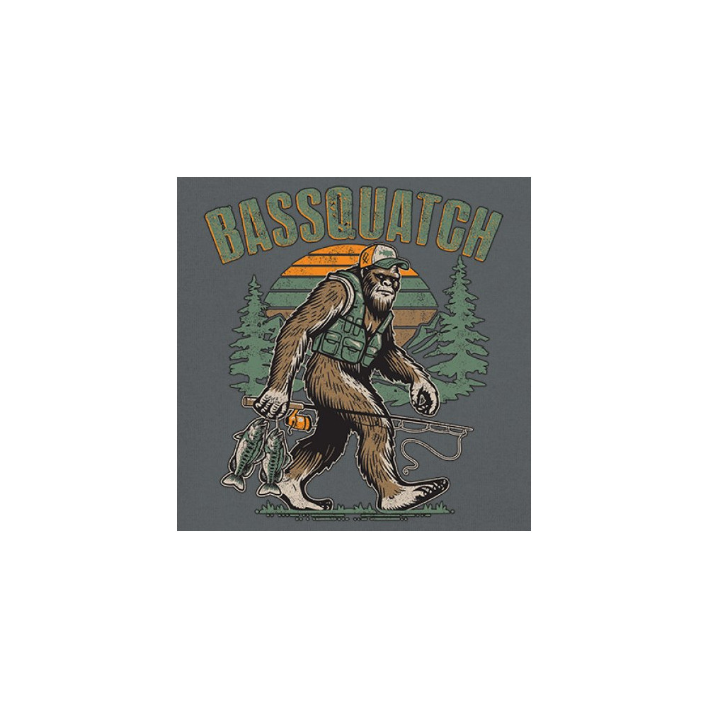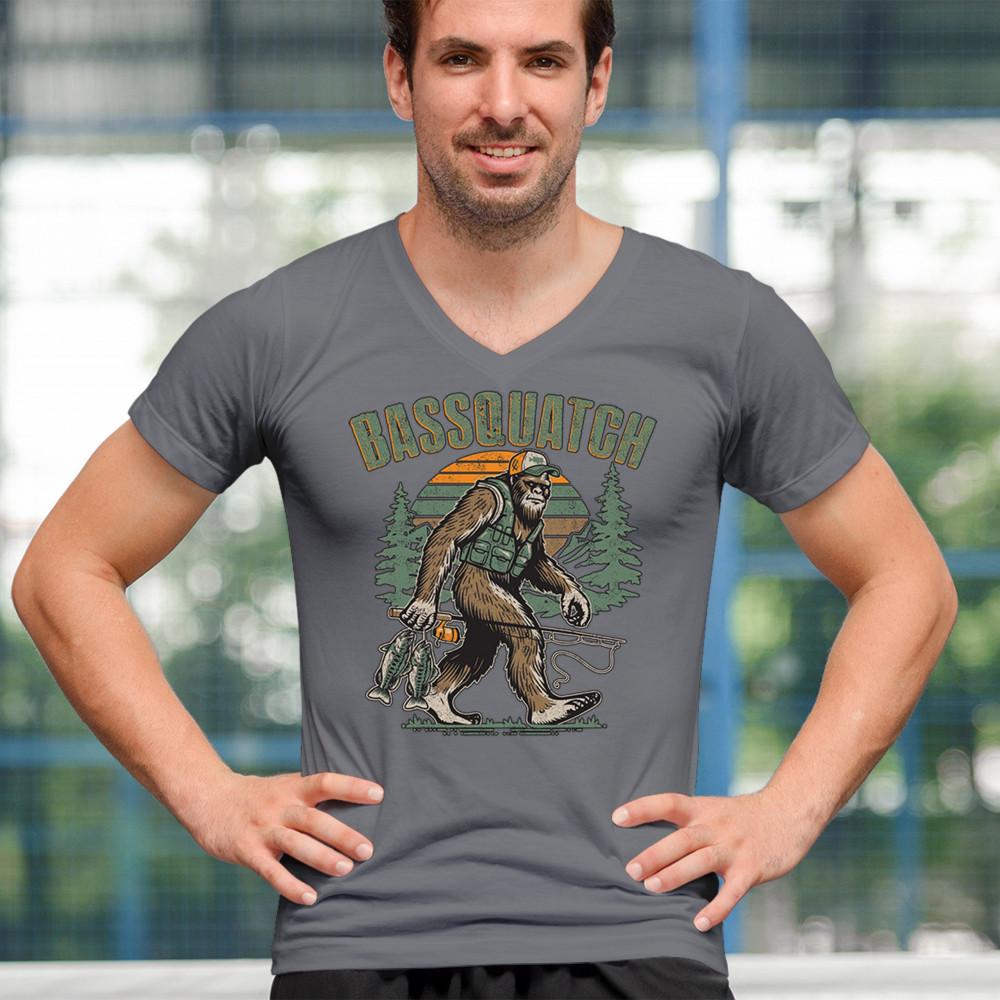 Funny Bassquatch design blends Bigfoot, fishing humor, and retro forest style. Great for anglers, cryptid lovers, and outdoorsy pun fans.