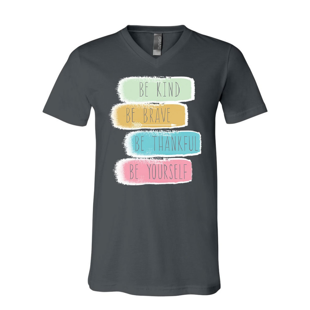 BE YOURSELF be kind brave thankful v-neck t-shirt motivation positive tee charcoal