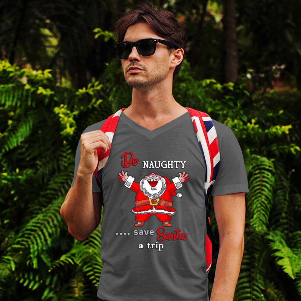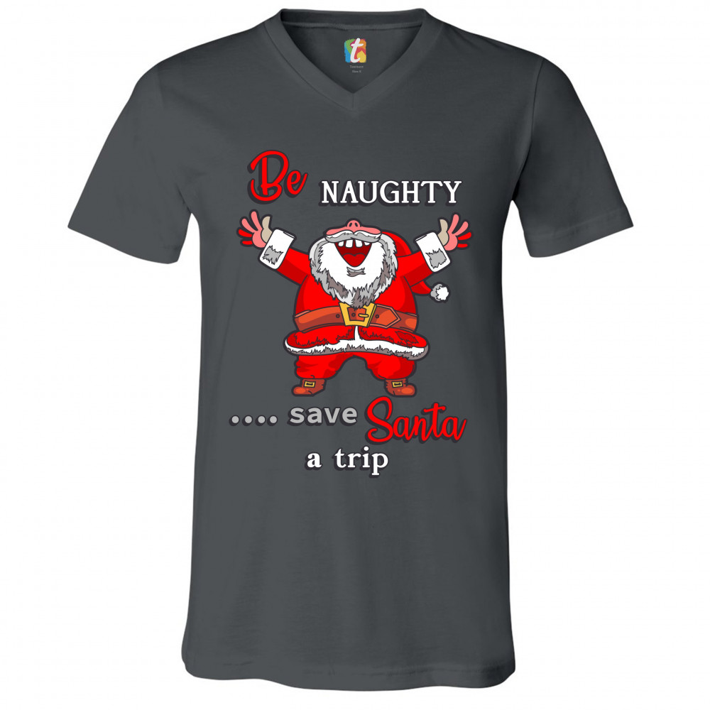 BE NAUGHTY SAVE SANTA A TRIP v-neck t-shirt holiday spirit christmas eve tee charcoal