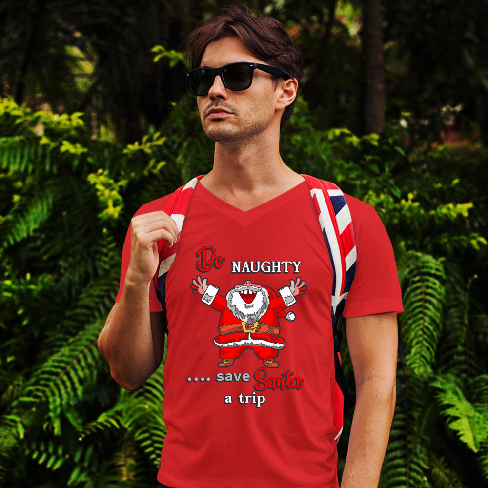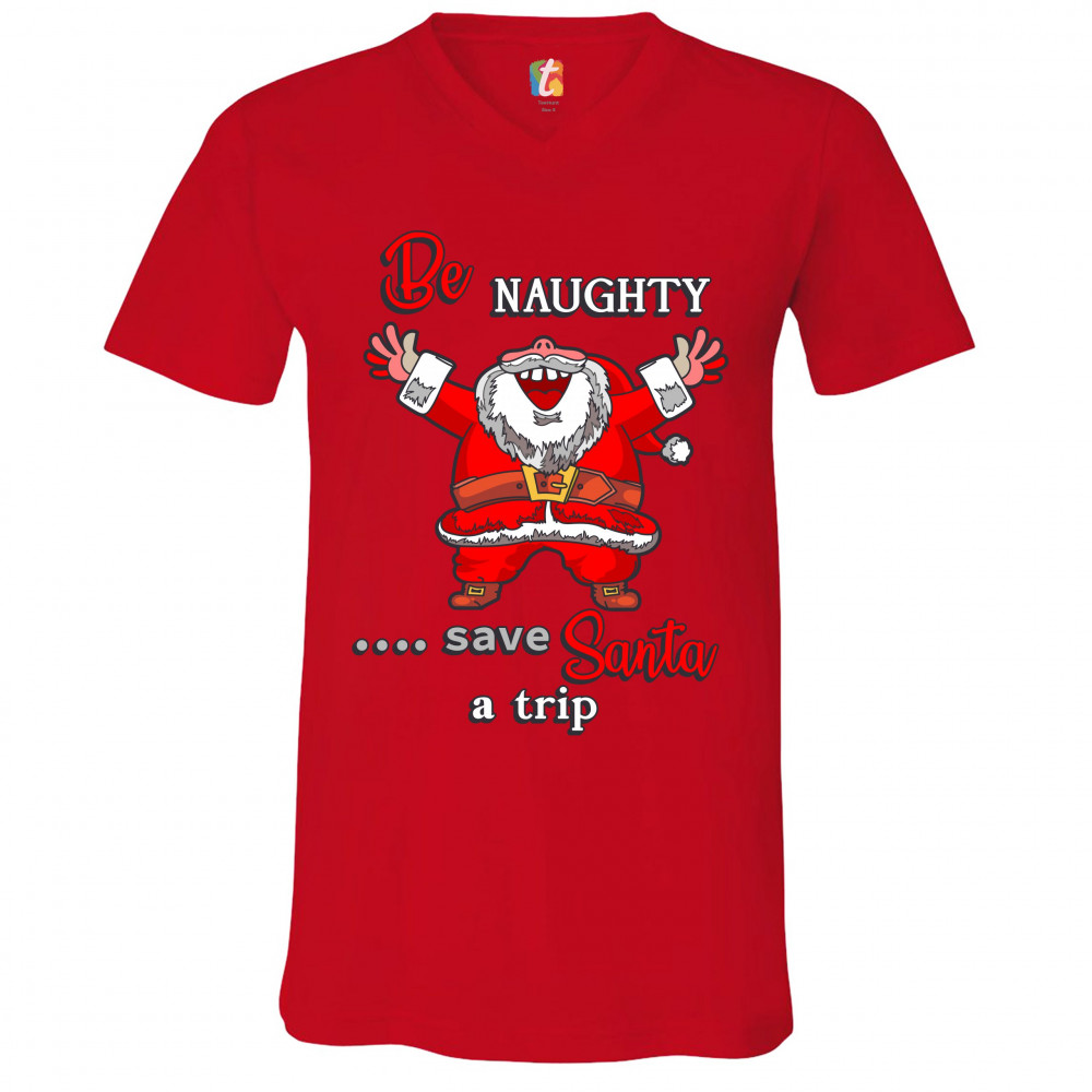 BE NAUGHTY SAVE SANTA A TRIP v-neck t-shirt holiday spirit christmas eve tee red