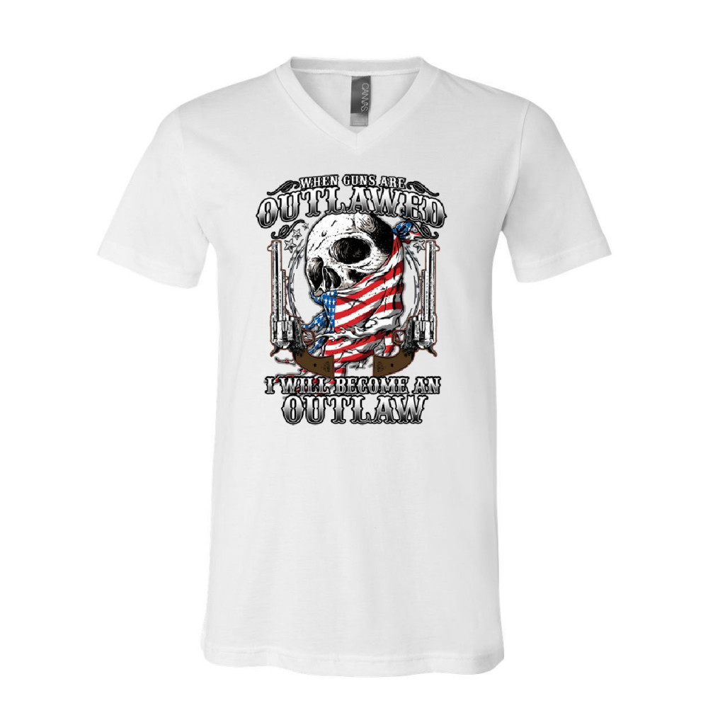BECOME AN OUTLAW v-neck t-shirt 2nd amendment right to bear arms skull tee white