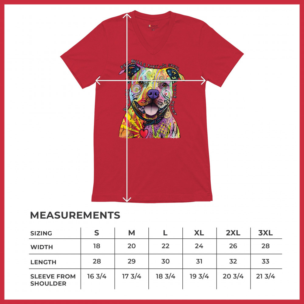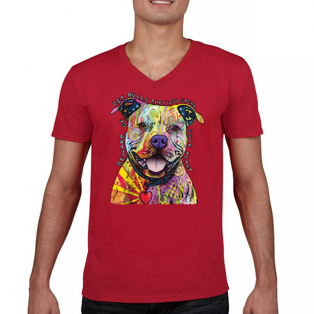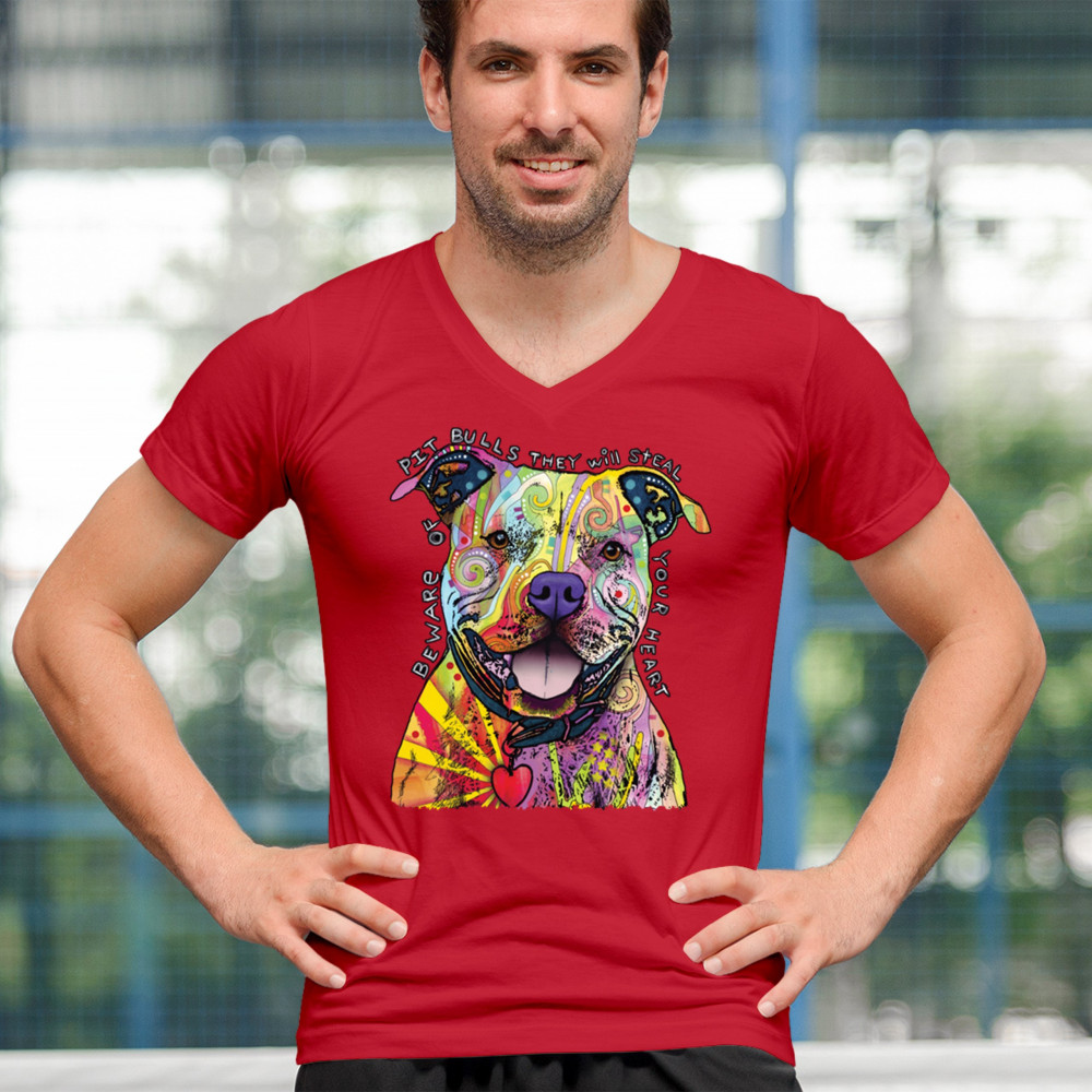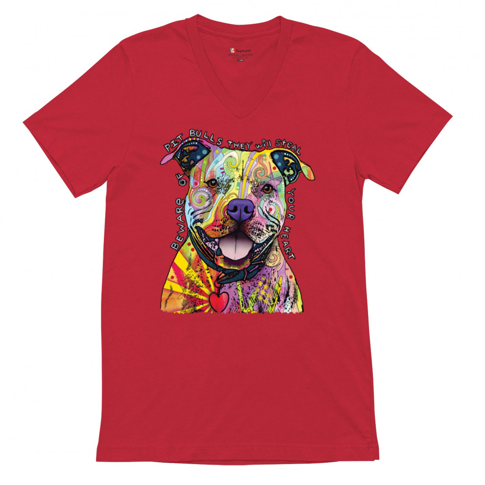 BEWARE OF PIT BULLS v-neck t-shirt dean russo art colorful cute dog tee red