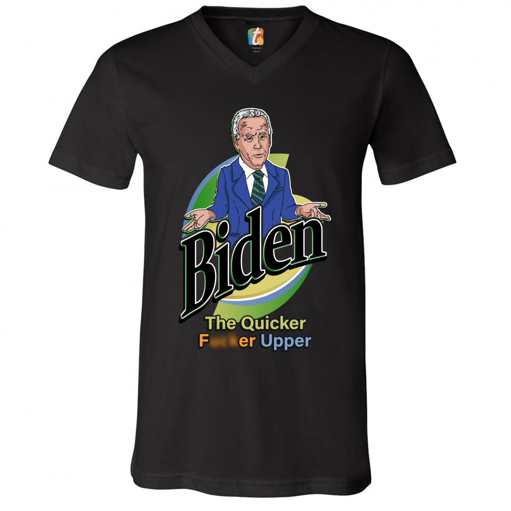A funny political print featuring a confused Joe Biden shrugging his shoulders and spreading his arms. The print says "Biden the Quicker F*cker Upper". A great choice to wear for a Trump rally or give as a gift to a Donald Trump supporter before 2024 pres