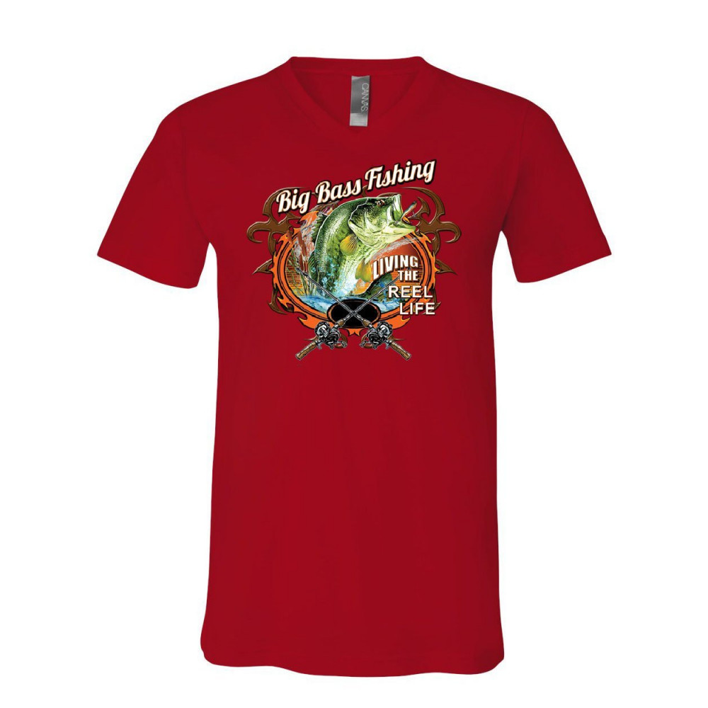BIG BASS FISHING v-neck t-shirt living the reel life fisherman spinning tee red