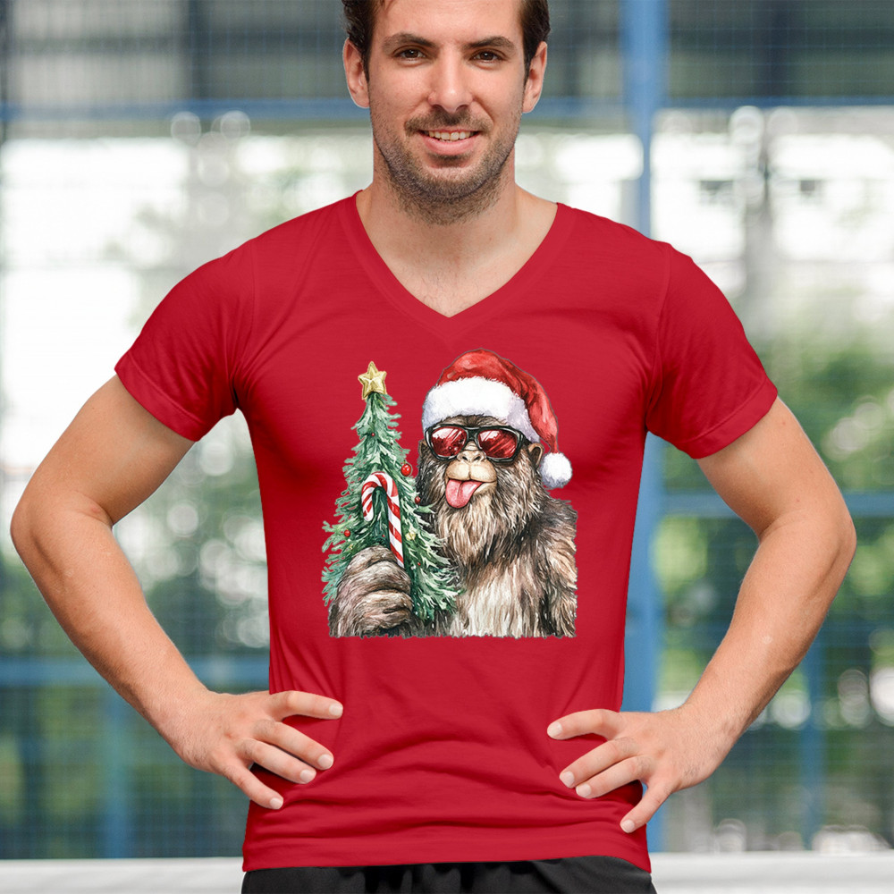 Bigfoot Christmas Santa shirt – festive Sasquatch holiday humor tee with Santa hat design, Xmas tree, candy cane, and funny Christmas style.