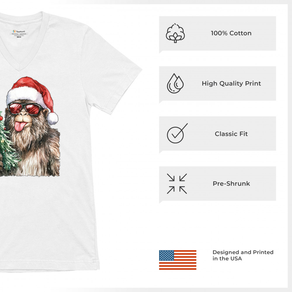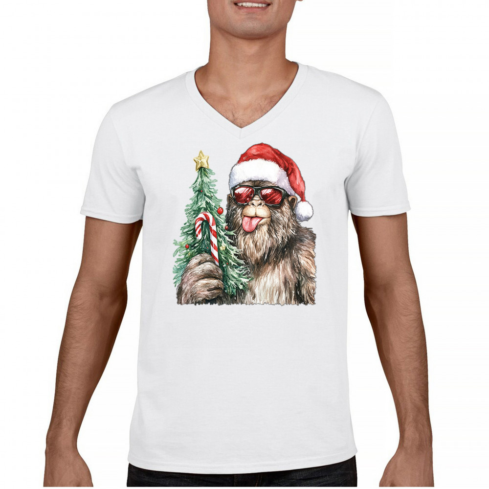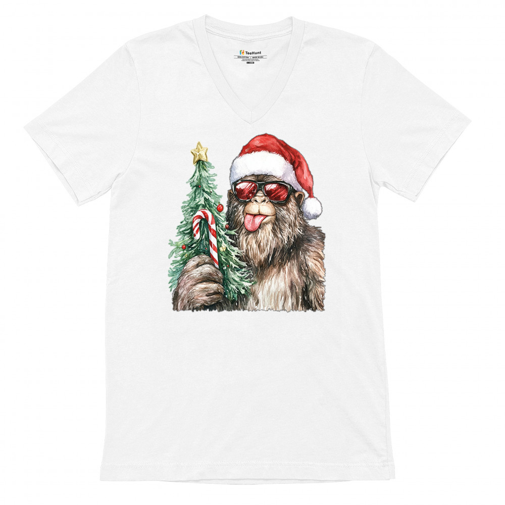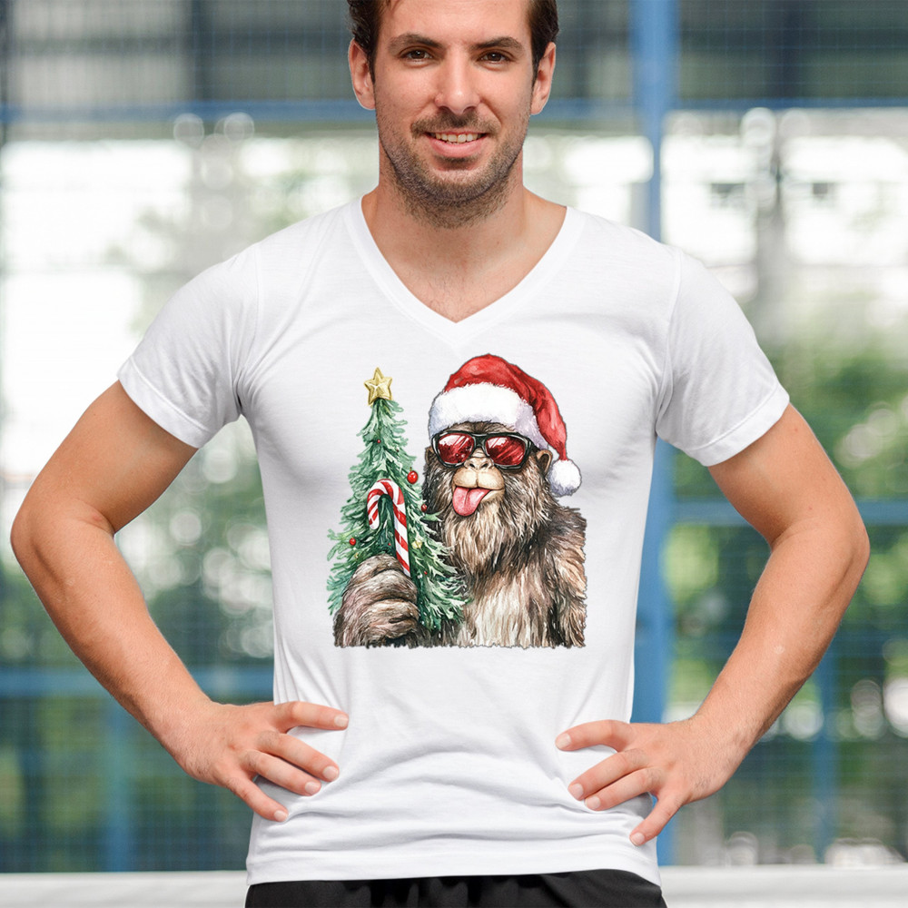 Bigfoot Christmas Santa shirt – festive Sasquatch holiday humor tee with Santa hat design, Xmas tree, candy cane, and funny Christmas style.