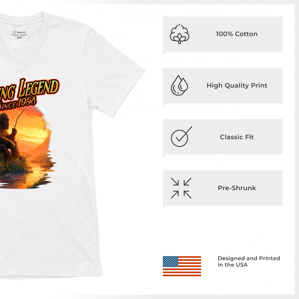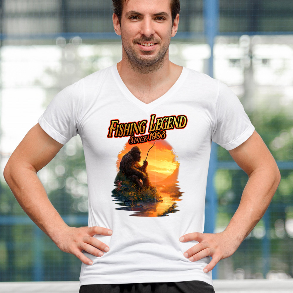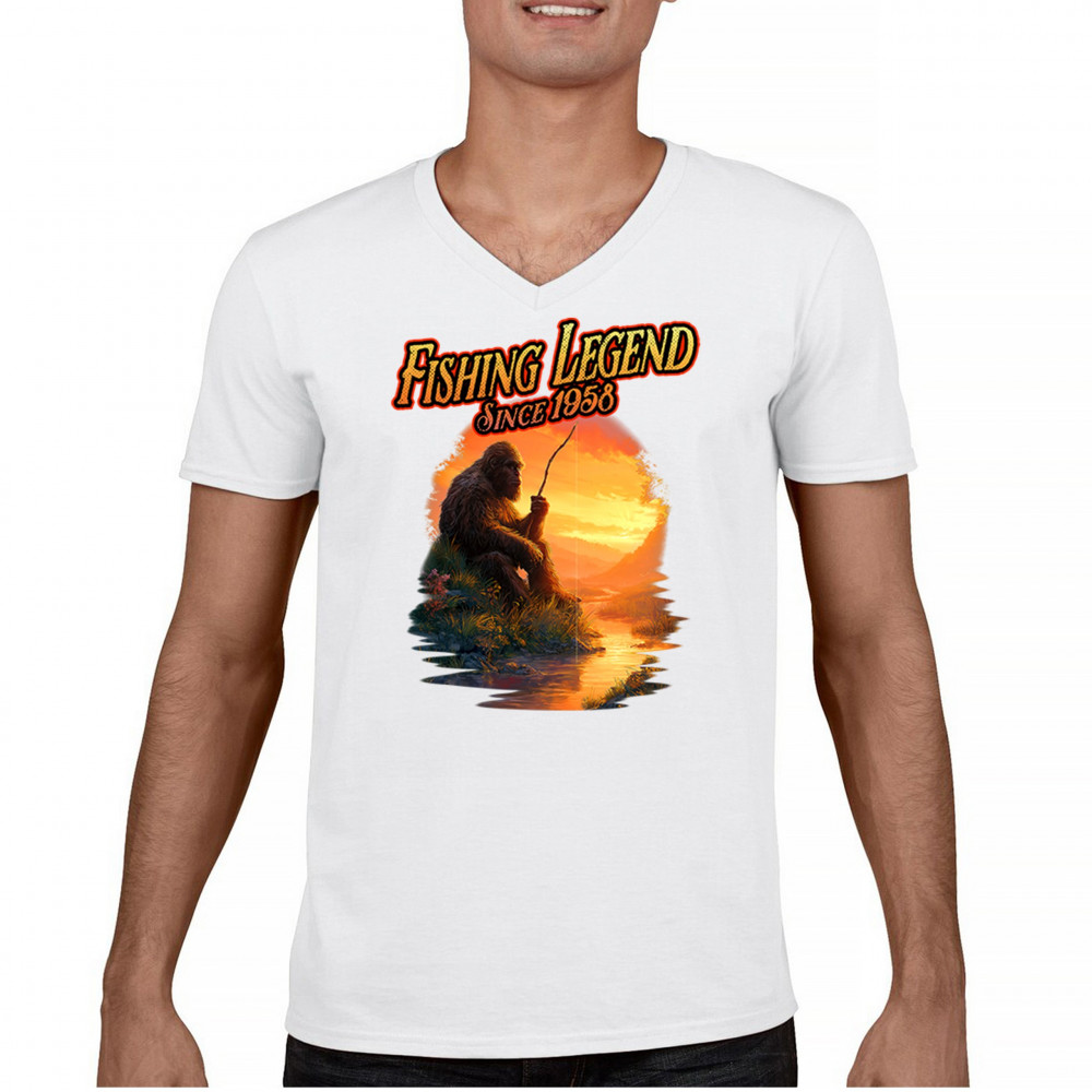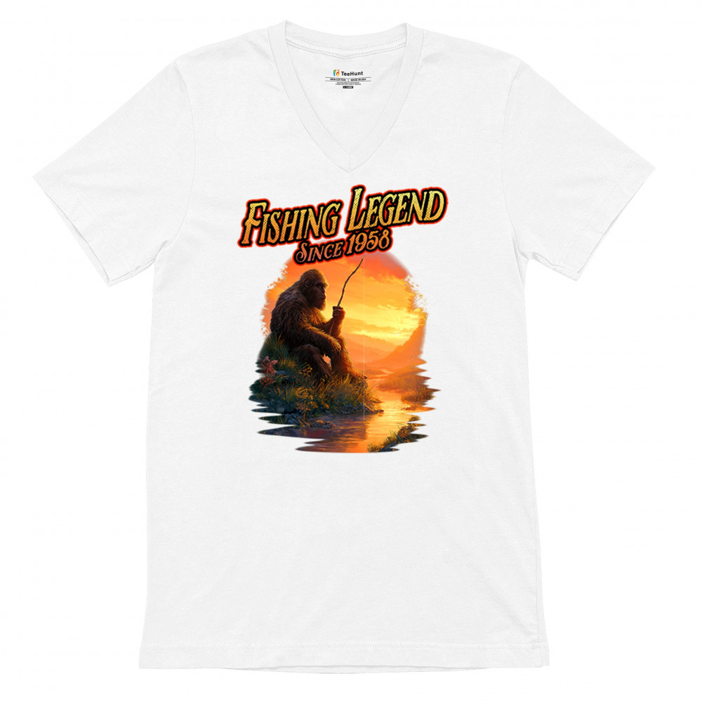 Bigfoot fishing legend design with Sasquatch lifestyle, retro vintage humor, funny wilderness shirt, Father’s Day gift, and campfire style.