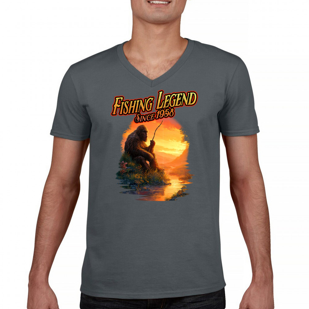 Bigfoot fishing legend design with Sasquatch lifestyle, retro vintage humor, funny wilderness shirt, Father’s Day gift, and campfire style.
