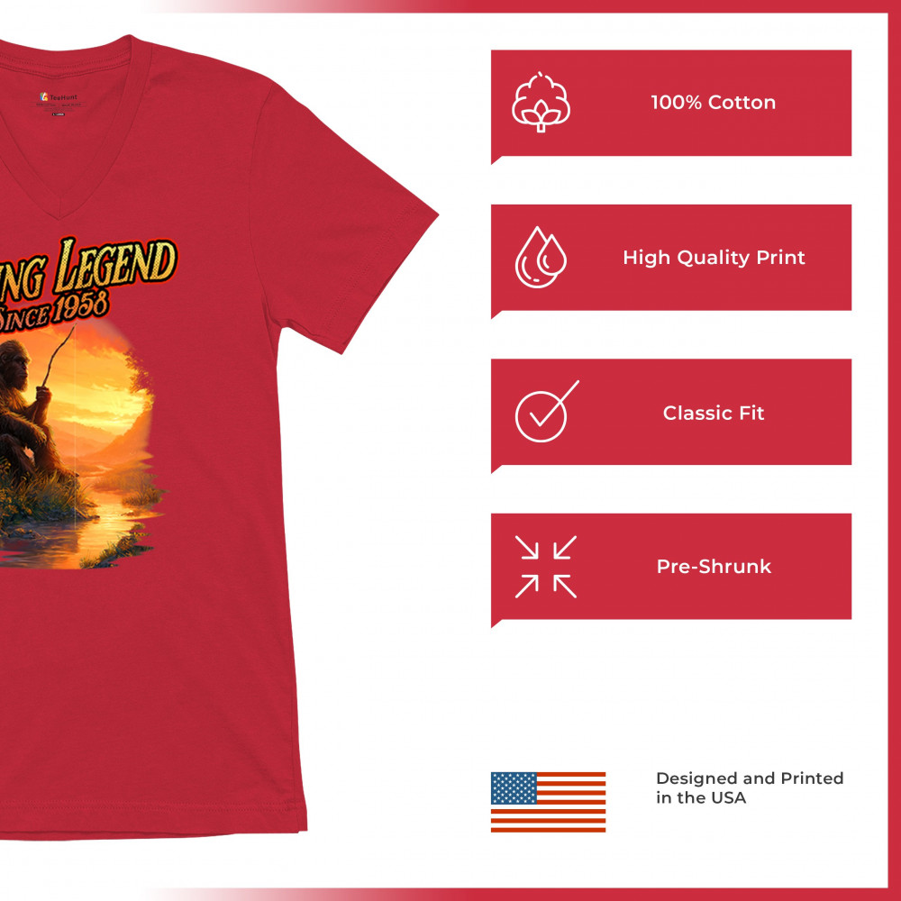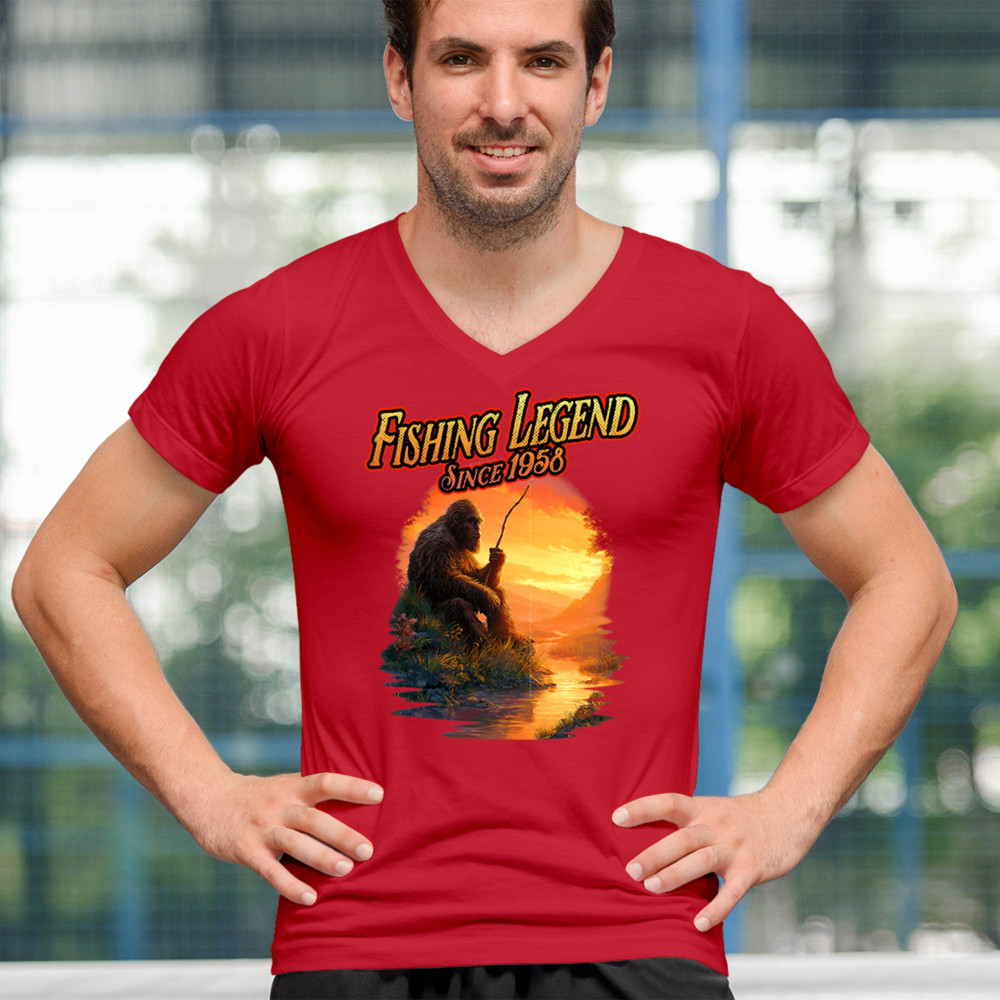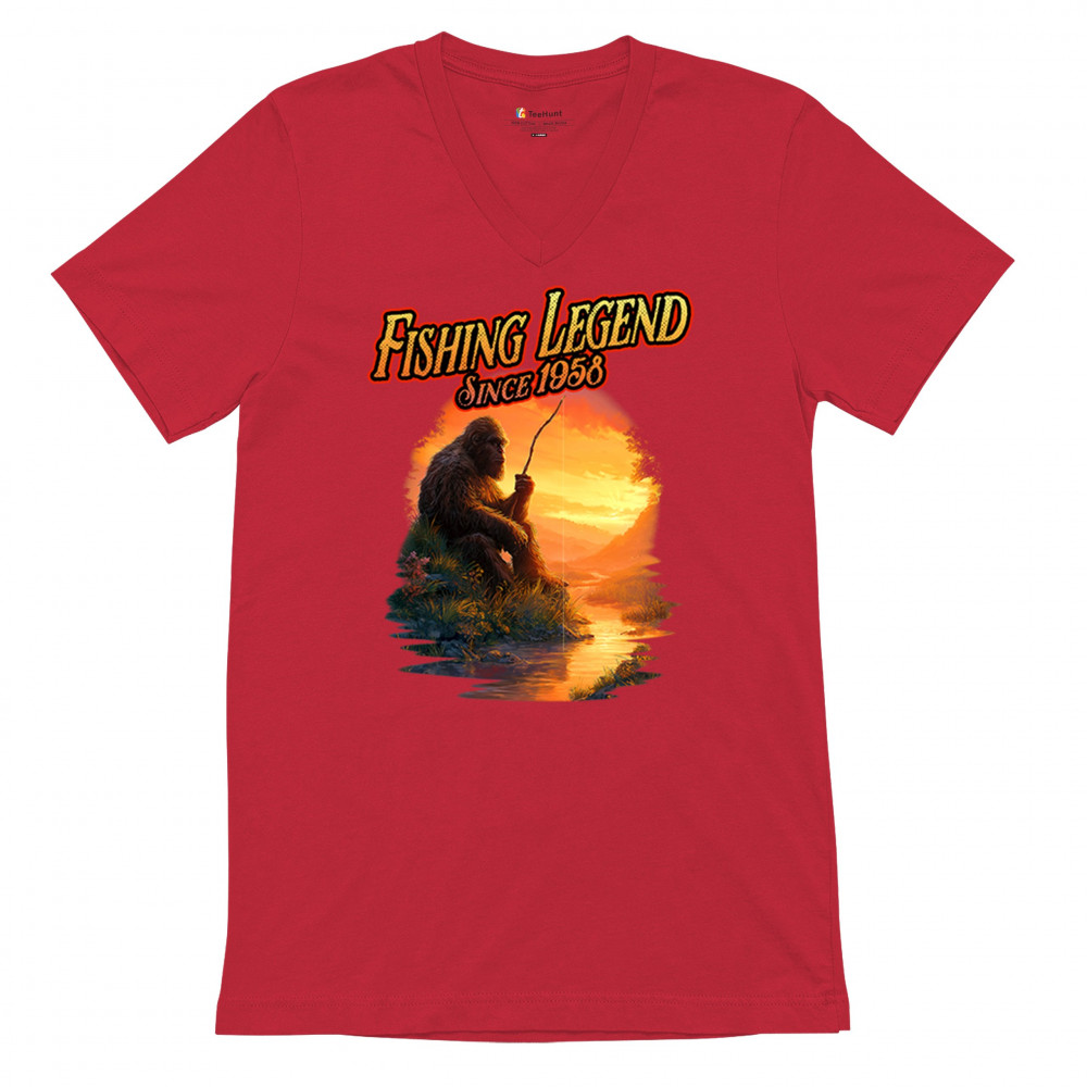 Bigfoot fishing legend design with Sasquatch lifestyle, retro vintage humor, funny wilderness shirt, Father’s Day gift, and campfire style.