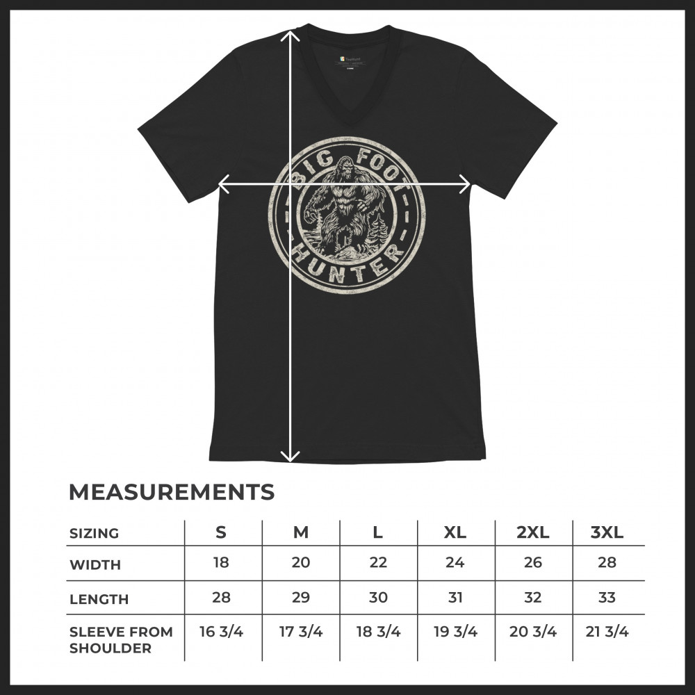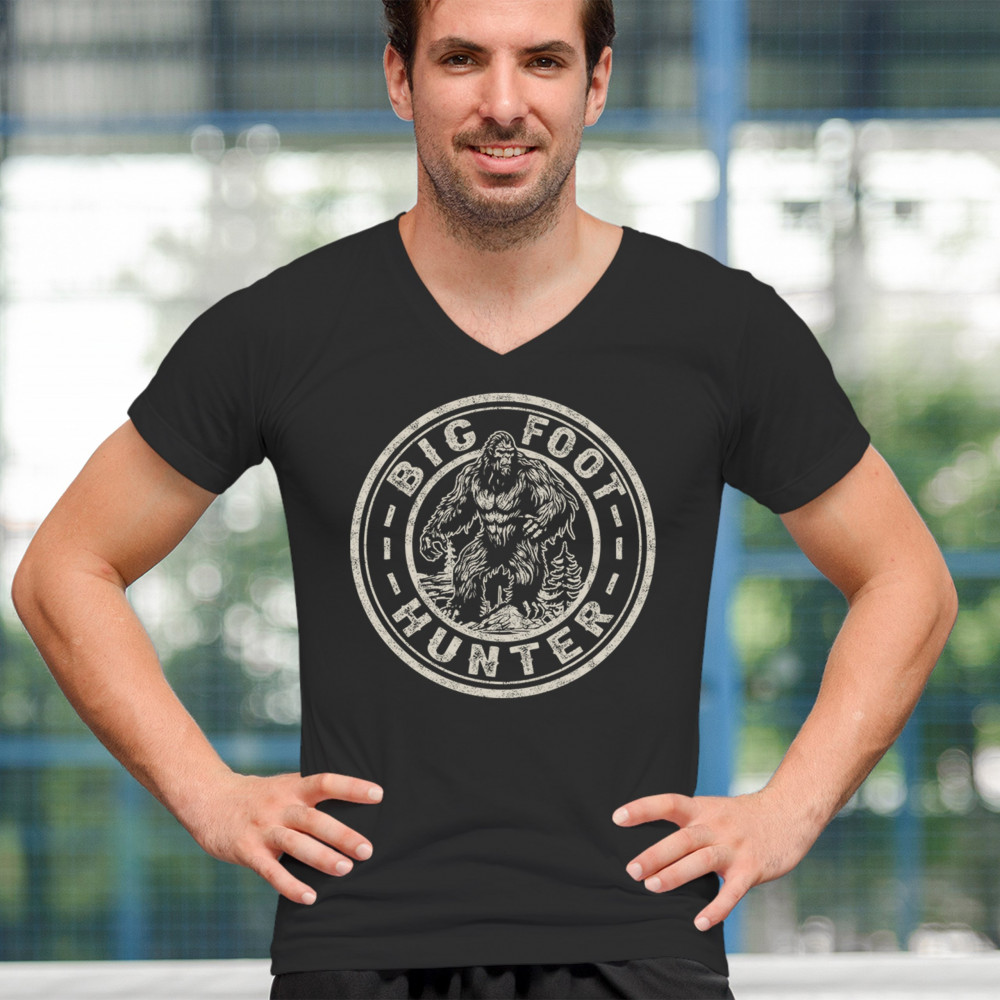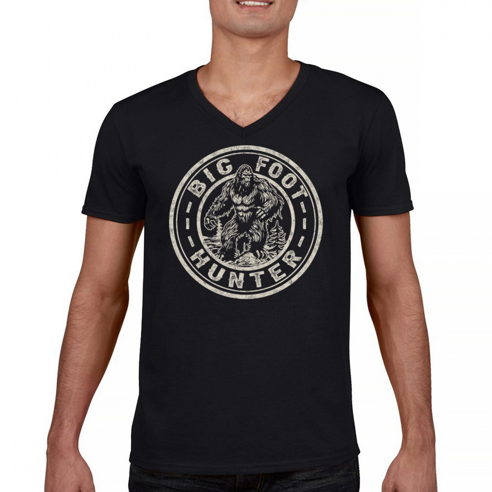 BIGFOOT HUNTER v-neck t-shirt funny sasquatch joke believe outdoor camping tee black