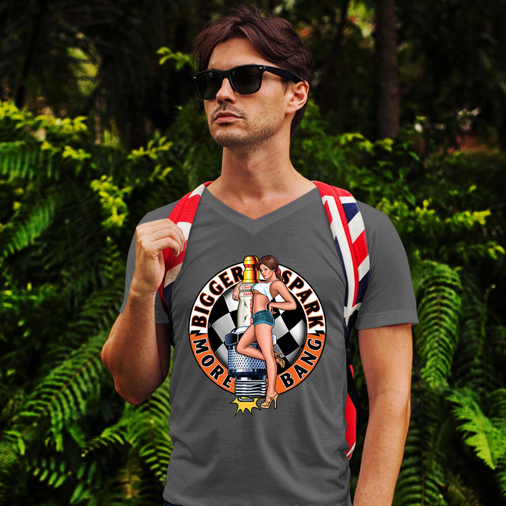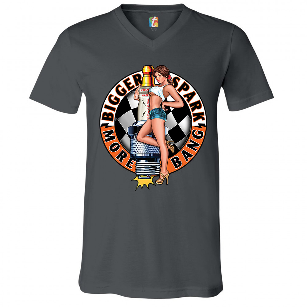 BIGGER SPARK MORE BANG v-neck t-shirt pin-up girl vintage automotive tee charcoal