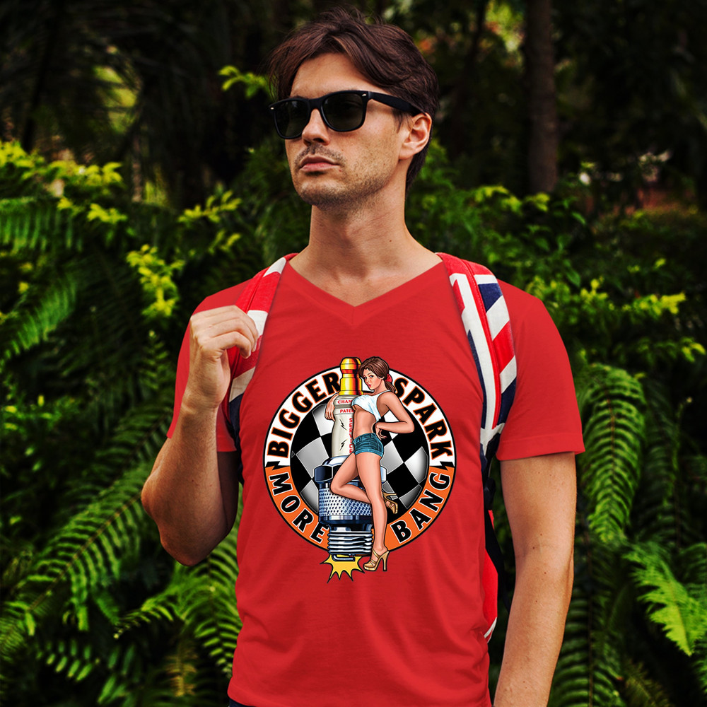 BIGGER SPARK MORE BANG v-neck t-shirt pin-up girl vintage automotive tee red