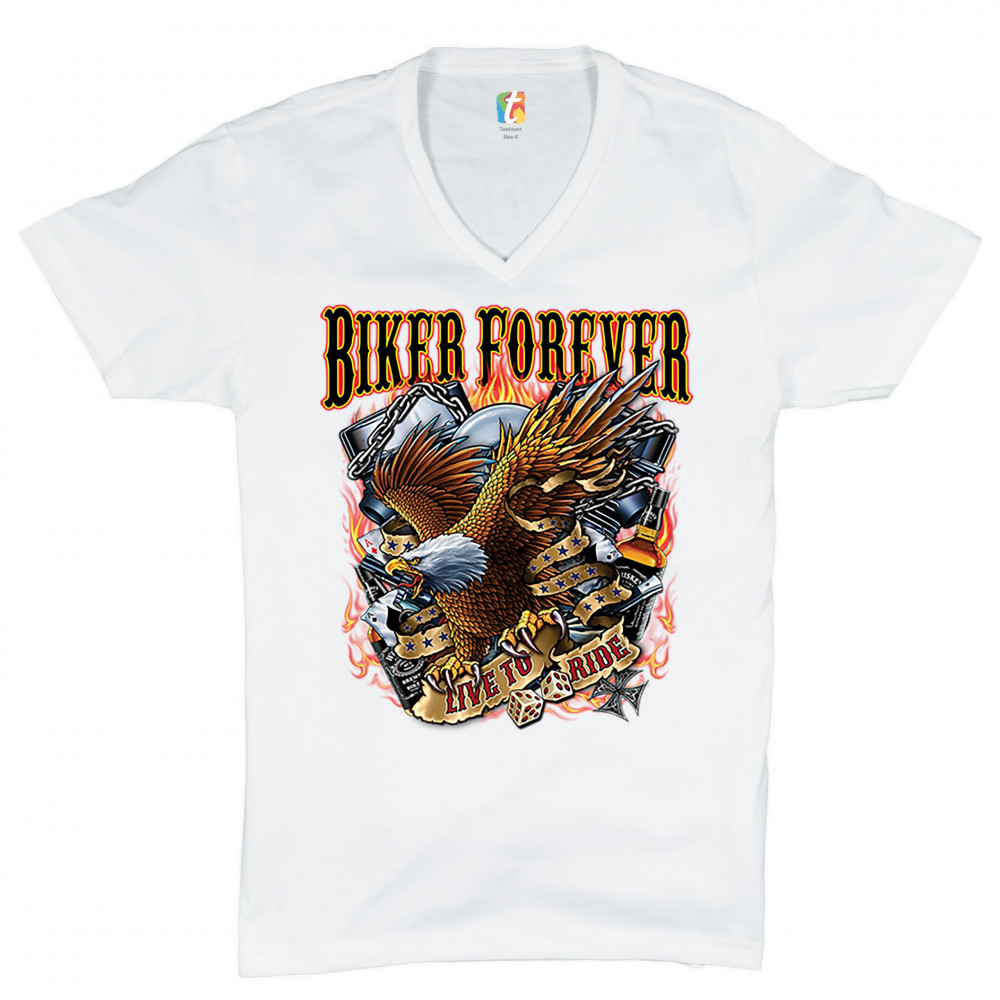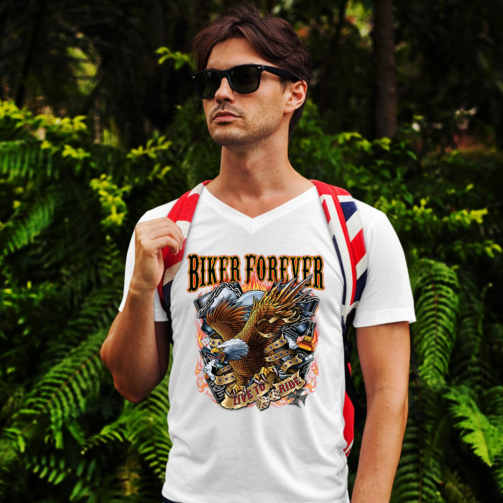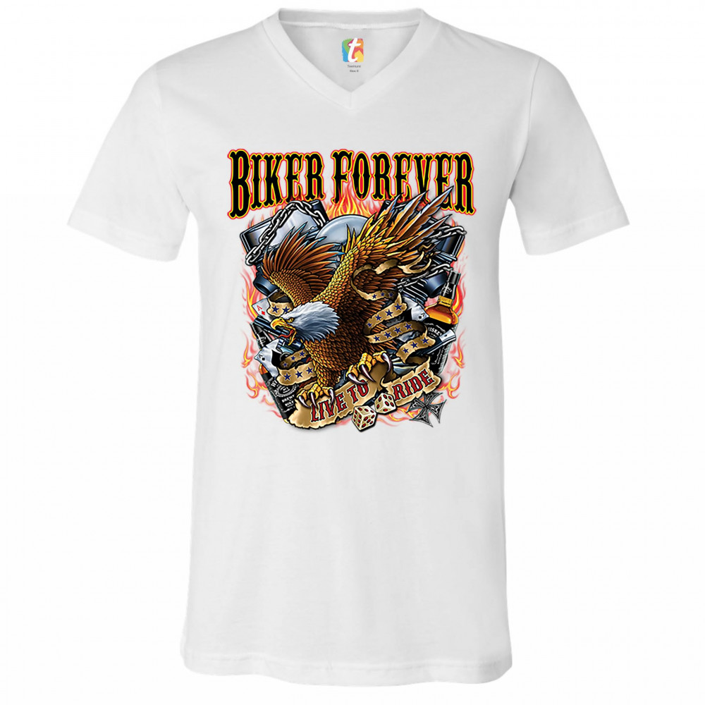 A print featuring an American bald eagle, holding a stripe with "live to ride" written on it, a v-engine in the background, a pair of dice and playing cards. At the top the print says: "biker forever". A great choice for a motorcycle enthusiast.