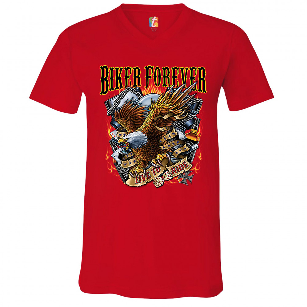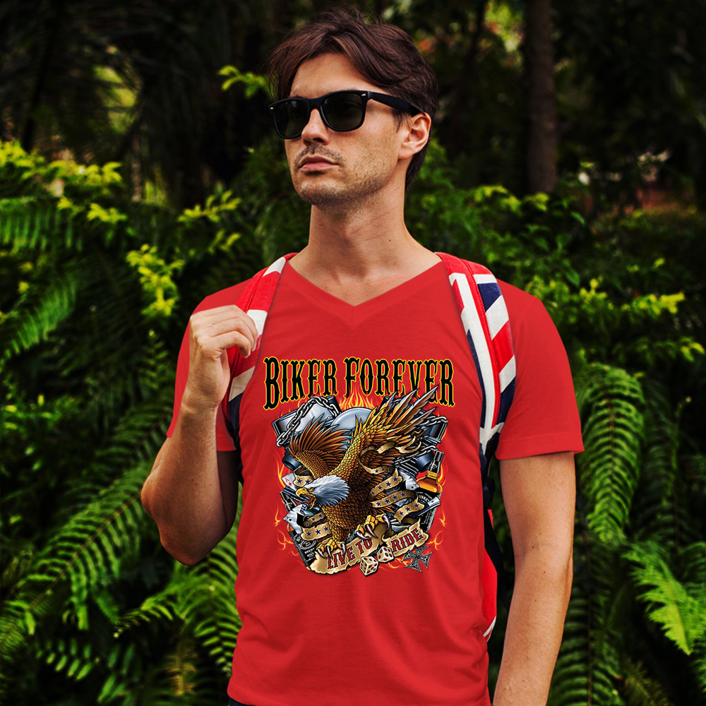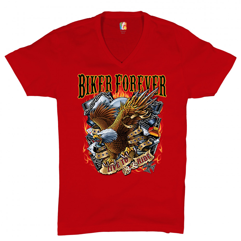 A print featuring an American bald eagle, holding a stripe with "live to ride" written on it, a v-engine in the background, a pair of dice and playing cards. At the top the print says: "biker forever". A great choice for a motorcycle enthusiast.