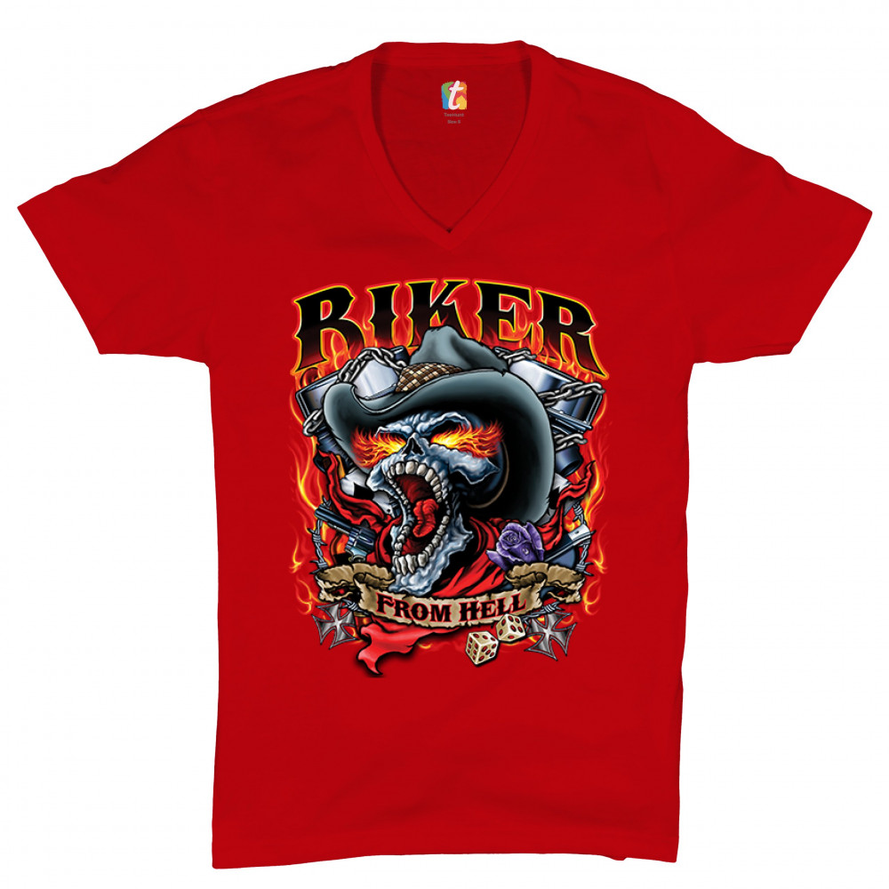 BIKER FROM HELL v-neck t-shirt ride or die skeleton outlaw route 66 tee red