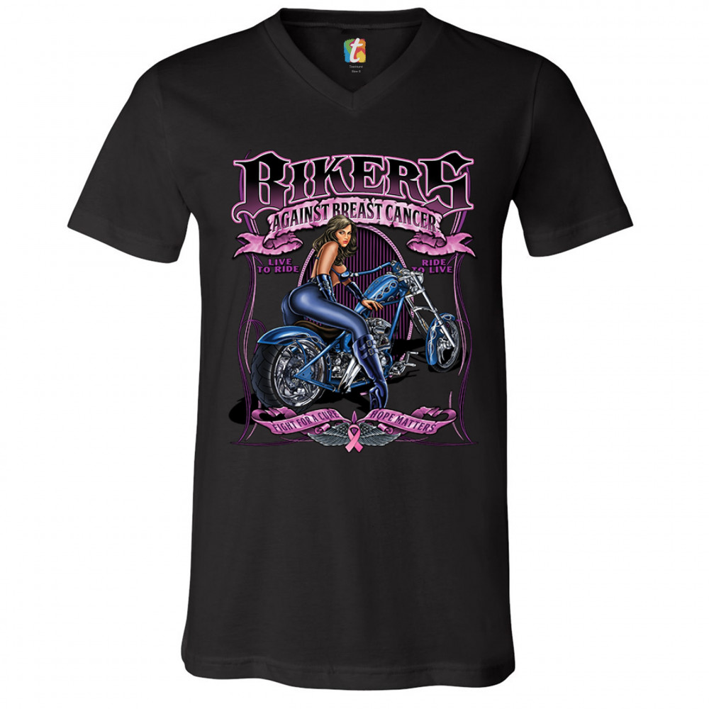 A print featuring a badass biker chick leaning on a chopper. The print says: "Bikers against breast cancer. Live to ride. Ride to live." At the bottom of the print there are two stripes with "fight for a cure, hope matters" written on them. Between the st