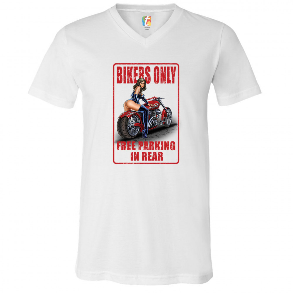 BIKERS ONLY FREE PARKING IN REAR v-neck t-shirt funny pin-up biker chick tee white
