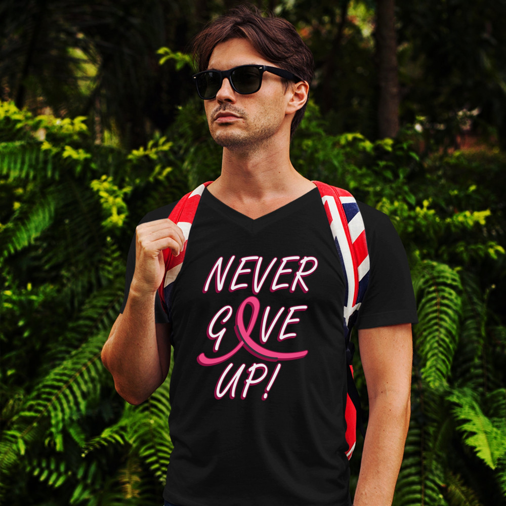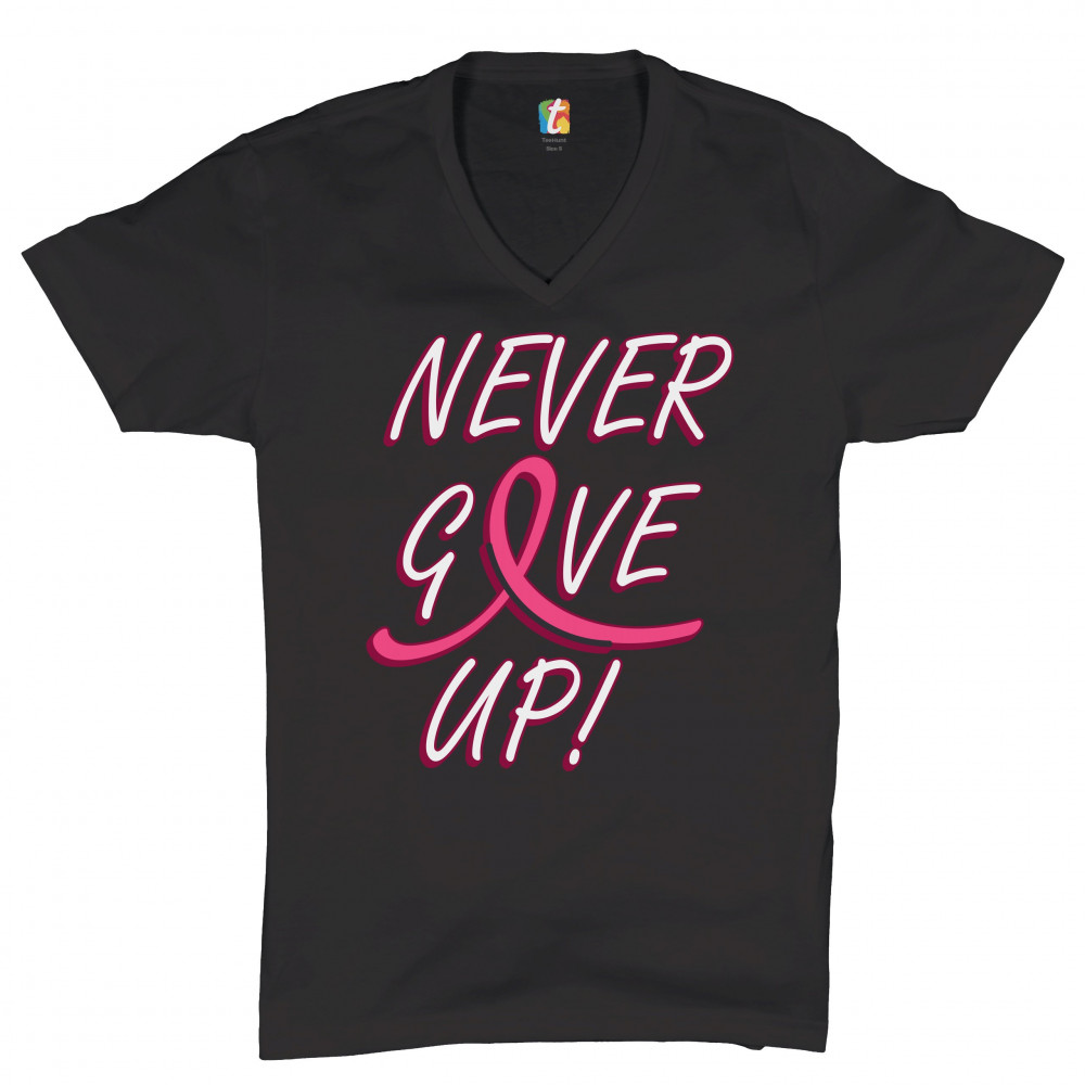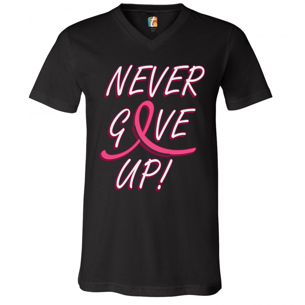 BREAST CANCER AWARENESS NEVER GIVE UP v-neck t-shirt pink ribbon tee black