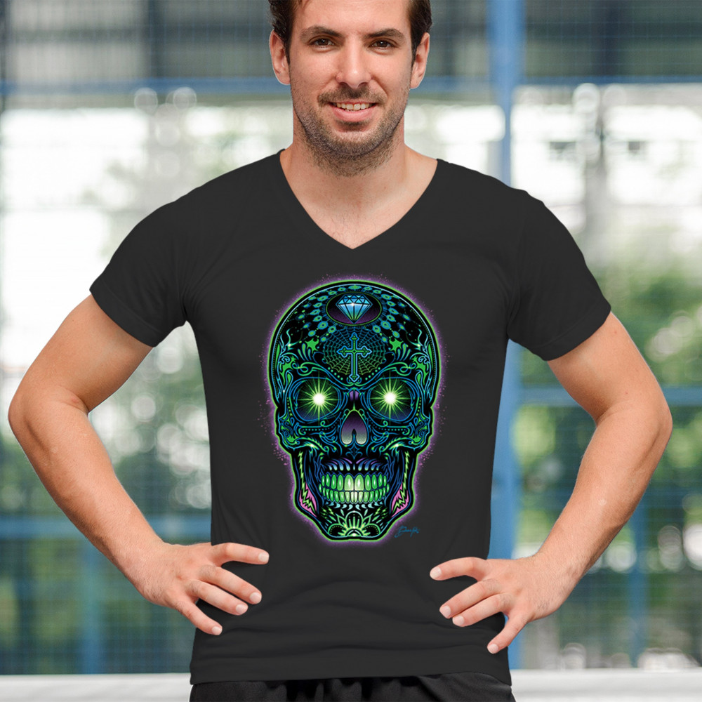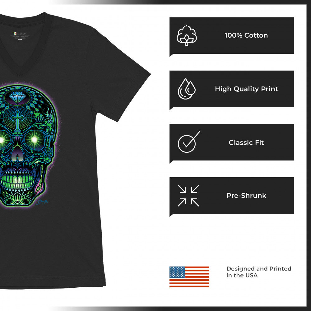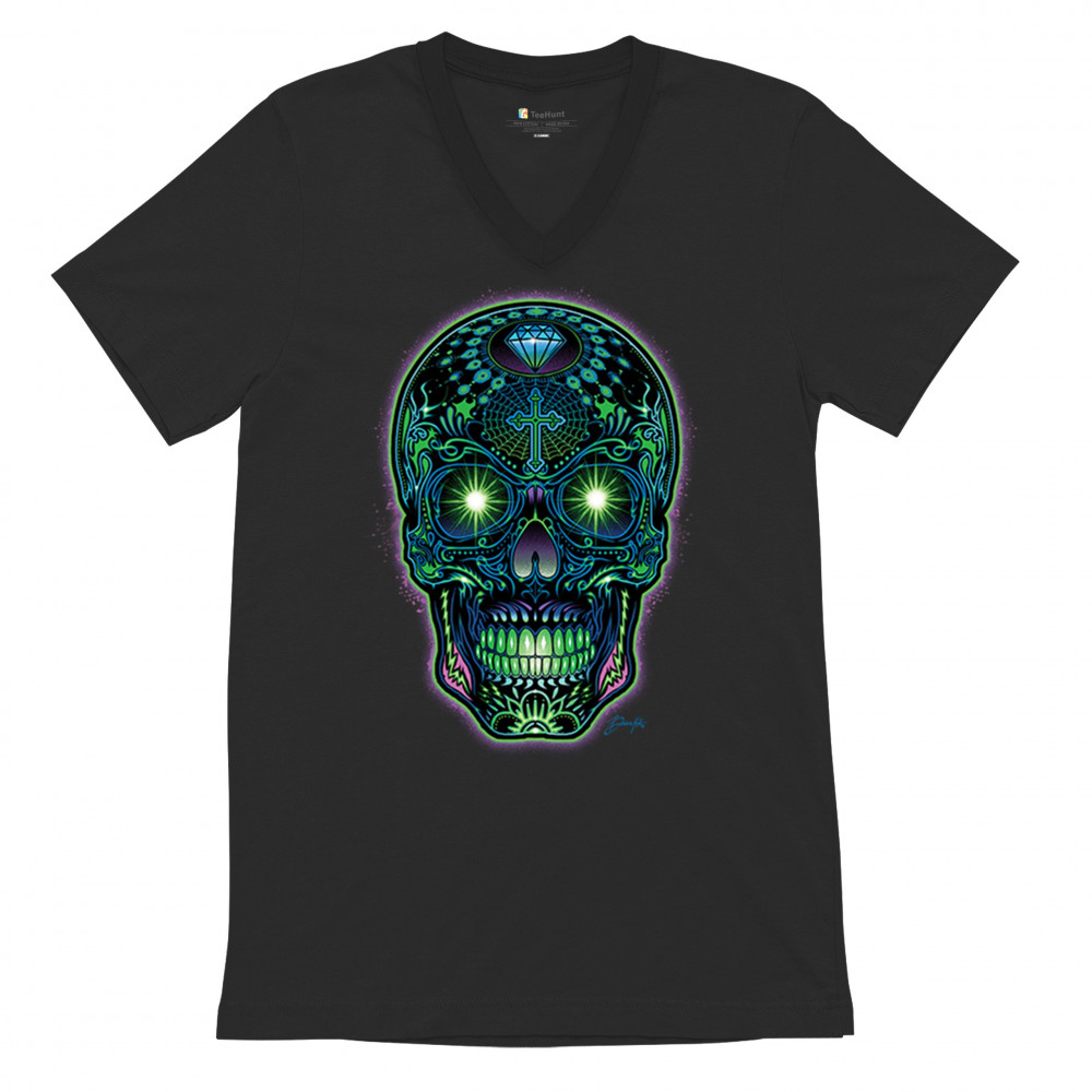BRIGHT SUGAR SKULL v-neck t-shirt dia de los muertos neon day of the dead tee black