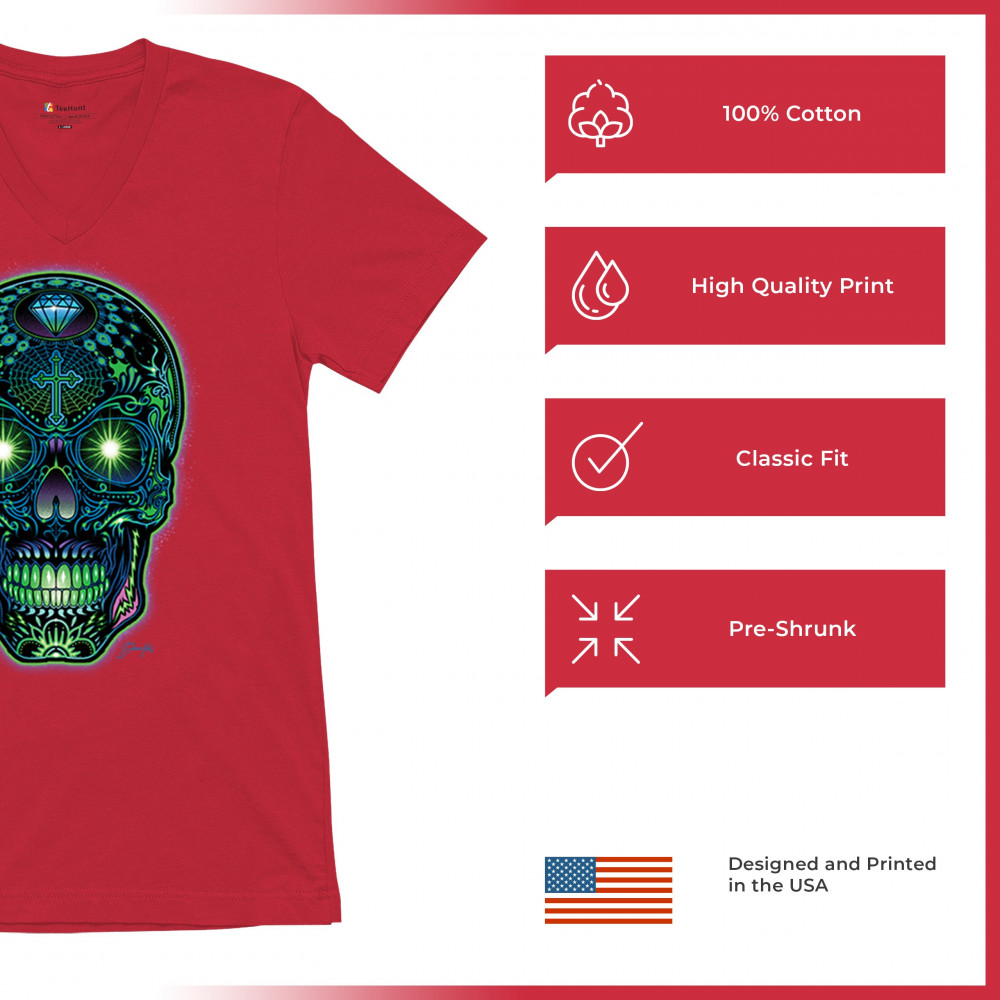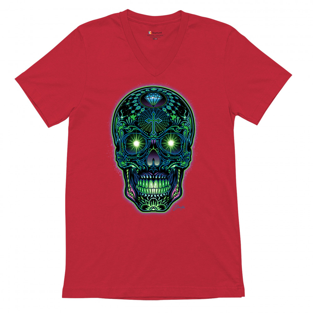 This electrified sugar skull design glows with neon energy and intricate details. Featuring green eyes, radiant cross, diamond, spider web, and vivid colors, it's a bold mash-up of psychedelic art, Day of the Dead tradition, and rave culture. A vibrant design perfect for skull fans and spiritual rebels alike.