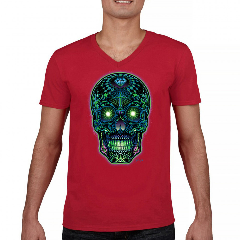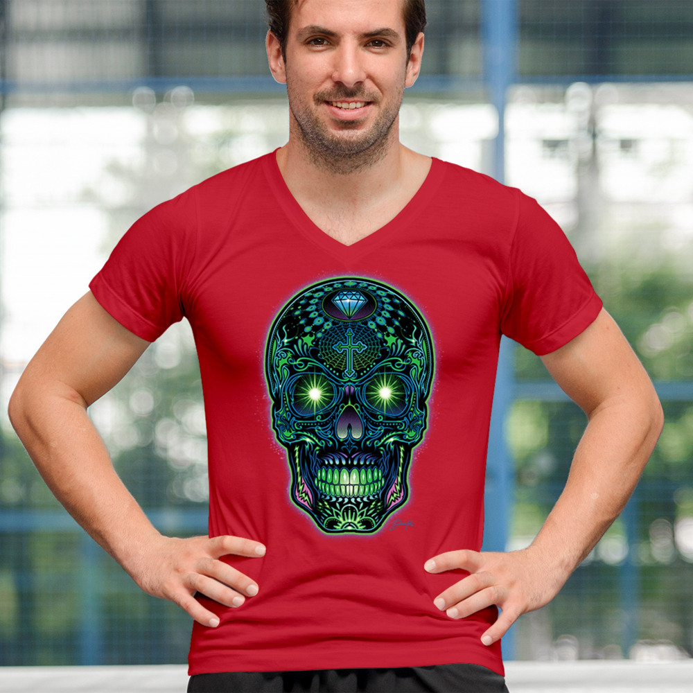 Electrified sugar skull with glowing green eyes, neon cross and diamond, perfect for rave lovers, skull art fans, and Day of the Dead style.